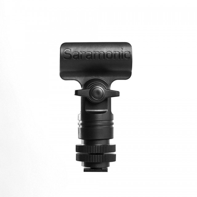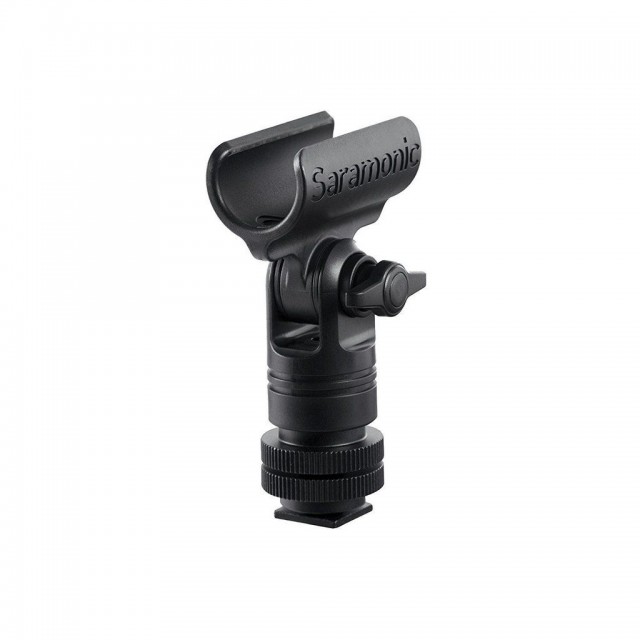 Soporte para micrófonos de 19-25 mm de diámetro, apto también para modelos tipo «rifle». Ofrece amplias posibilidades de fijación a cámaras, trípodes y bastones gracias al adaptador para zapata de flash y a los tornillos de 1/4-20”, 3/8” y 5/8”. Incluido en el paquete de los micrófonos Saramonic SR-TM1 y SR-TM7.