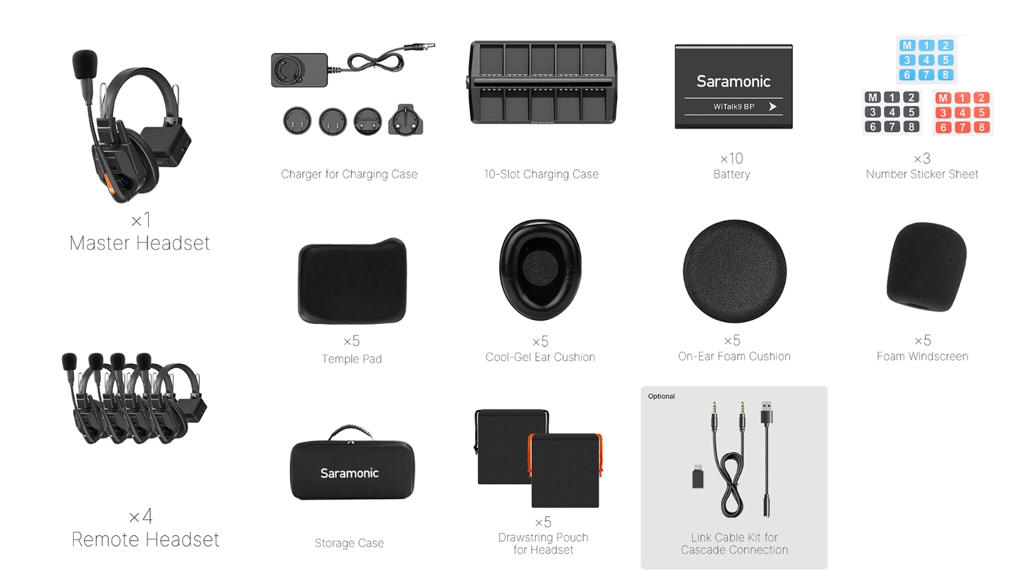 El Saramonic WiTalk9 WT5S es un potente y eficaz sistema de intercomunicación inalámbrico con funcionamiento totalmente dúplex que ofrece una solución sin concentrador para equipos de hasta nueve personas. Este kit incluye un auricular principal y cuatro auriculares remotos monoaurales, listos para su uso inmediato. El innovador diseño del sistema permite una futura ampliación de hasta 30 usuarios con cuatro kits mediante conexión en cascada por cable, lo que lo convierte en una solución escalable para necesidades crecientes . Los auriculares principales se pueden conectar a un teléfono o a un ordenador, lo que permite la comunicación remota entre regiones a través de software popular como Zoom y Teams.