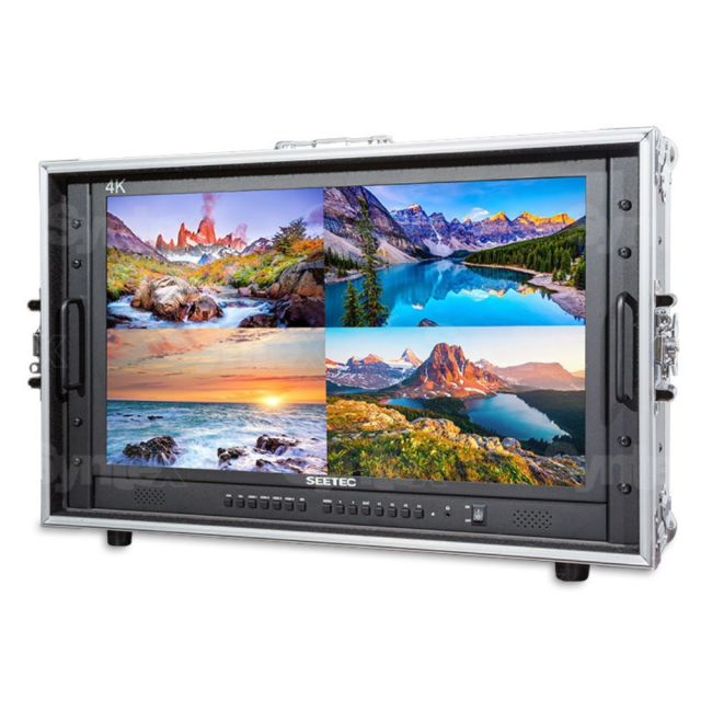 Monitor profesional 4K de 23,8" con carcasa tipo maletín de la serie Feelworld Seetec, con una resolución de 3840 x 2160, una relación de contraste de 1000:1 y una luminosidad de 310 cd/m². Además de la interfaz SDI, destaca la presencia de 4 entradas HDMI y la función Quad View para monitorizar cuatro fuentes de vídeo a la vez. El monitor está integrado en un maletín rígido con parasol plegable. Tampoco faltan entradas DVI/VGA/audio, salida de auriculares, altavoces integrados, V-Mount, puerto de señalización/luz y una amplia gama de funciones de medición, incluyendo asistencia al enfoque, inversión de imagen, modo pixel-to-pixel, etc.