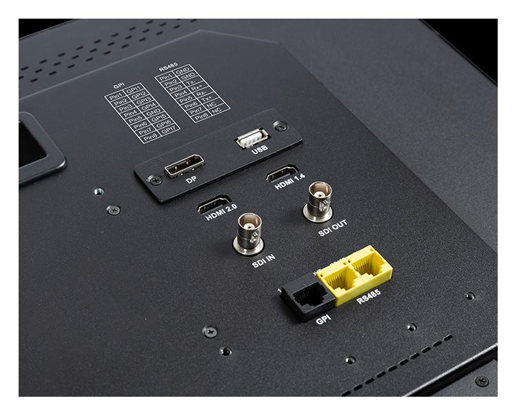 Monitor de dirección profesional con panel LCD de 21,5 pulgadas (1920 x 1080, 16:9, 250 cd/m², 3000:1, ángulos de visión de 178°) y entradas 3G-SDI, HDMI 2.0, HDMI 1.4, RS-485, GPI, DP (DisplayPort) y USB. Gracias a su gran superficie de pantalla y a las correcciones 3D LUT, es el candidato ideal para puestos de posproducción, regidor o cámaras en localizaciones de rodaje. Las correcciones 3D LUT incluyen C-Log Standard, C-Log Full, S-log2, S-log3 y BMD-4Klog (admite la importación de hasta 16 tablas de 17x17x17, 33x33x33 y 65x65x65 a través de la interfaz USB). El monitor también ofrece una luz indicadora, salida SDI, altavoz integrado, salida de auriculares, placa de batería para acumuladores V-Mount (opcionalmente Gold Mount), entrada de alimentación con conector XLR4 y un robusto marco de aluminio. Por supuesto, incluye funciones de asistencia al enfoque, zoom, Pixel-to-Pixel, rotación de la imagen, control de fotogramas, visualización de medidores de audio, etc. Opcionalmente, se puede suministrar con una maleta de aluminio a medida.