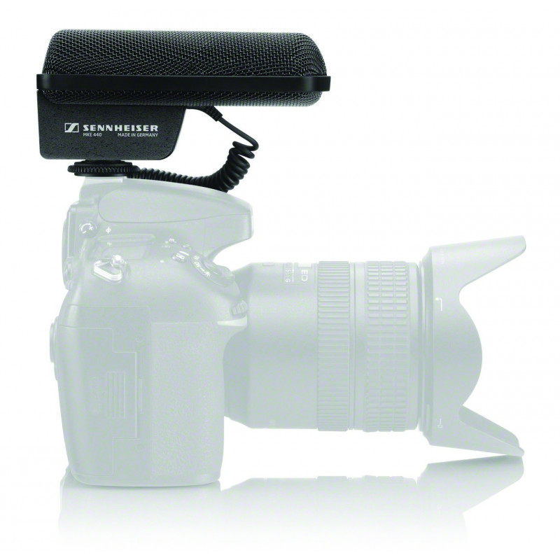 El micrófono estéreo MKE 440 es ideal para cámaras digitales (D-SLR) y videocámaras digitales. Graba el sonido mediante dos cápsulas microfonicas direccionales dispuestas en forma de V (V-estéreo). A diferencia de otros micrófonos estéreo para cámaras, capta el sonido de la imagen capturada sin ruidos molestos laterales ni traseros.