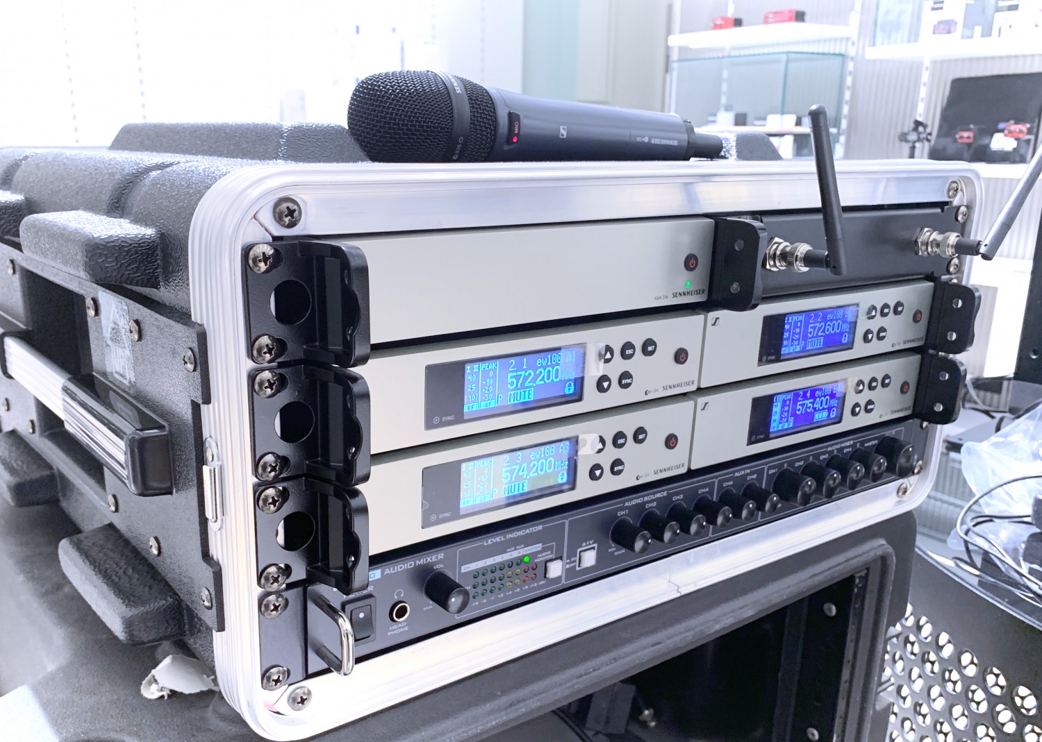 El kit de Sennheiser permite la transmisión de 2 a 4 canales independientes. Este sistema móvil es la solución ideal para streaming, presentaciones en línea o pequeños estudios de televisión. El conjunto está compuesto por receptores EM 100 G4 conectados en un kit que permite la configuración sincronizada y la búsqueda rápida de frecuencias libres para todos…