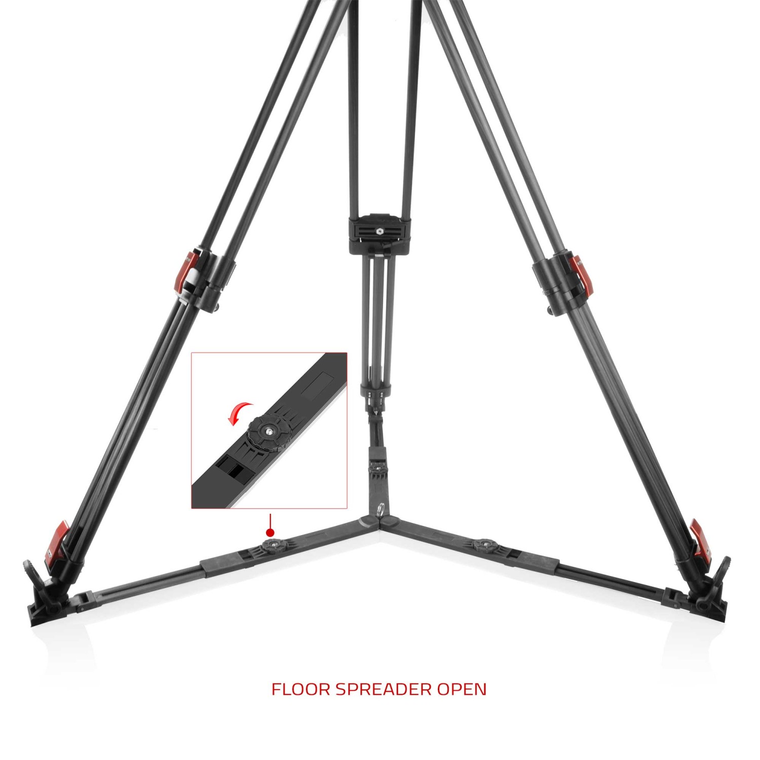 Las patas de fibra de carbono de dos secciones con una base de 100 mm de diámetro están diseñadas para cabezales fluidos de trípode de 100 mm (HD15) y cuentan con abrazaderas de aluminio muy resistentes para fijar el trípode a la altura adecuada. Las patas son sólidas, estables y resistentes a la corrosión, a la vez que ligeras y fáciles de usar. El sistema cuenta con un amplio rango de altura de 16 1/8" a 58 1/2" (41 a 148,5 cm) para tomas desde ángulos bajos y altos utilizando el separador de suelo incluido. La parte inferior de las patas, una vez retirado el esparcidor, está provista de puntas de aluminio que permiten fotografiar sobre superficies heladas o resbaladizas. Al desplazarse por terrenos irregulares, las patas se pueden ajustar de forma independiente (montañas rocosas). Las patas están equipadas con una base de copa de 100 mm para un rápido nivelado del cabezal. El paquete incluye una bolsa de transporte acolchada para un transporte seguro.