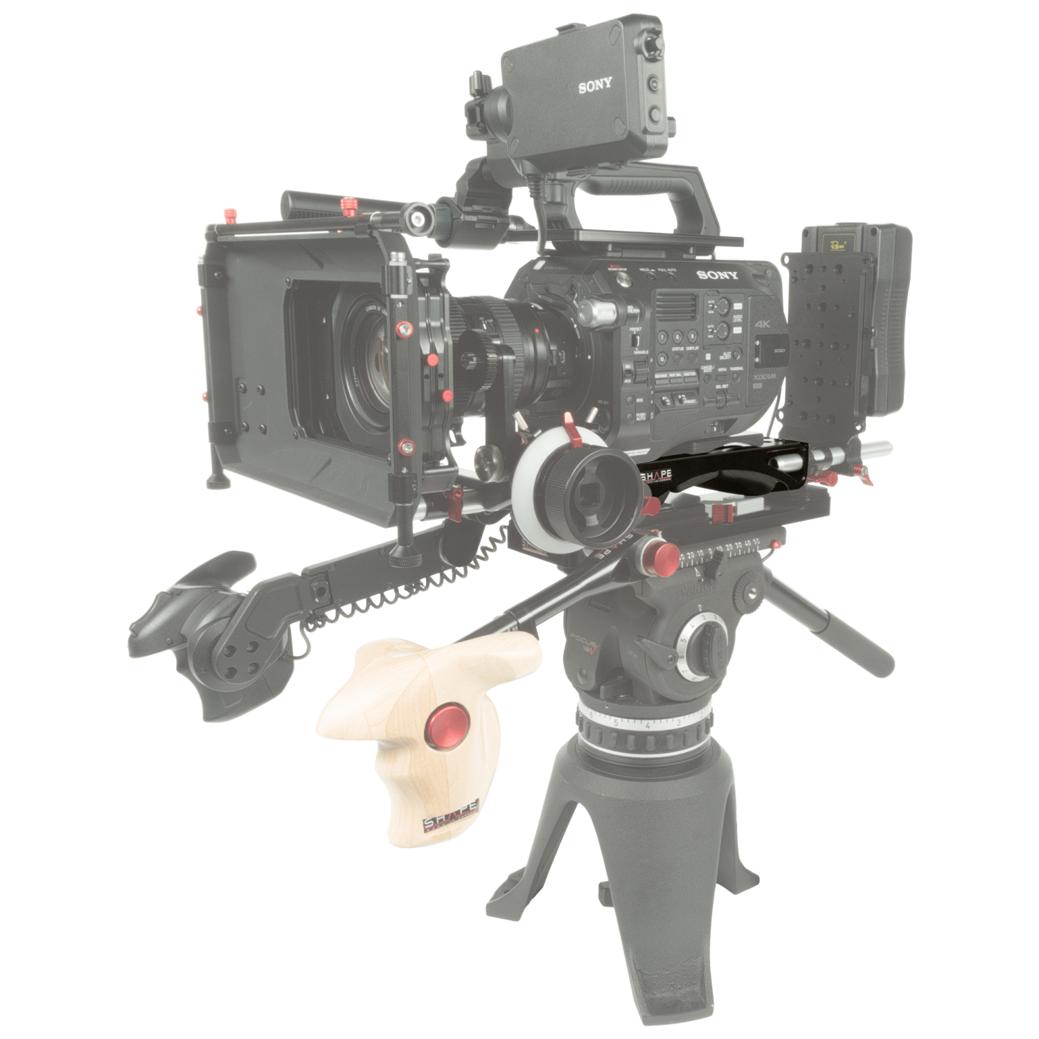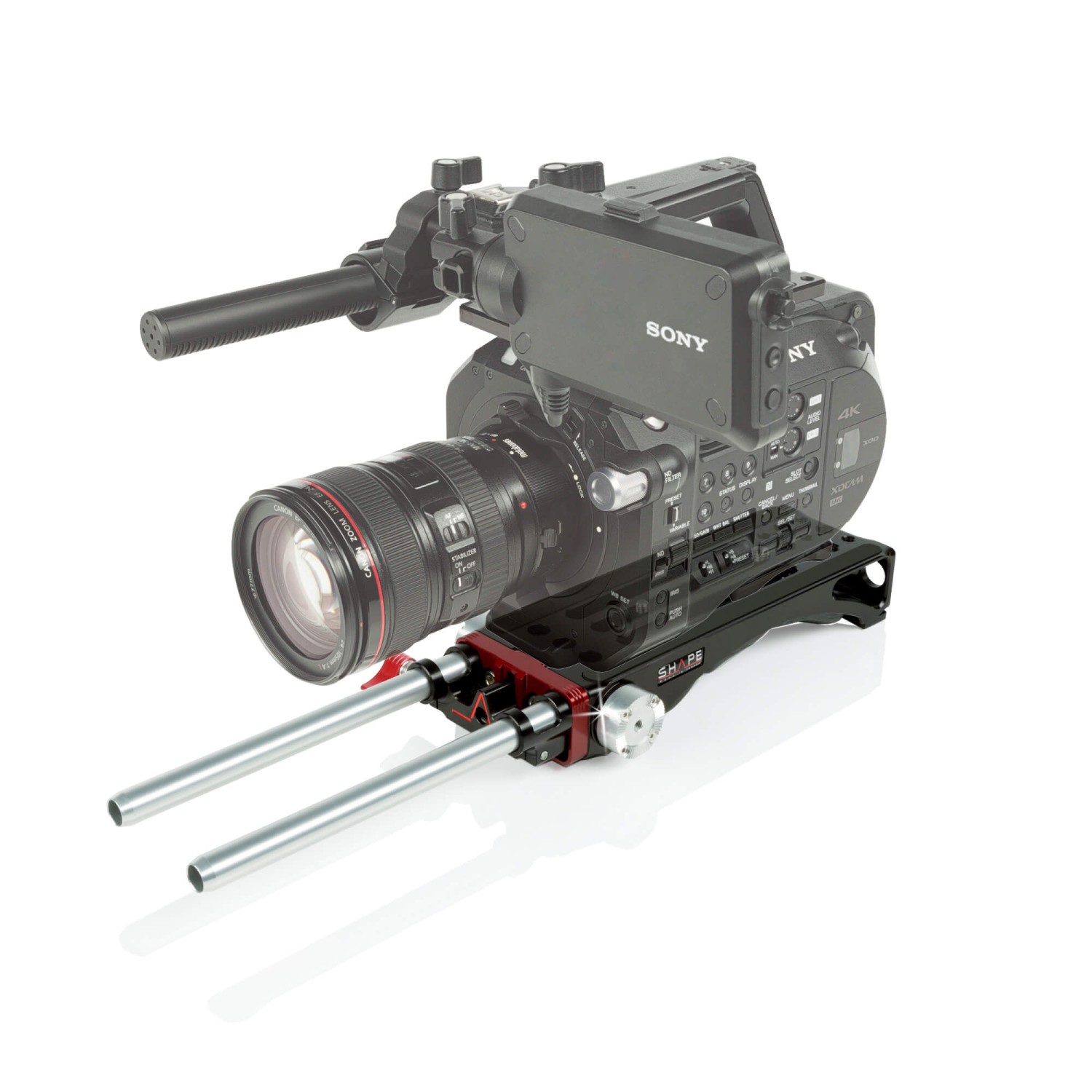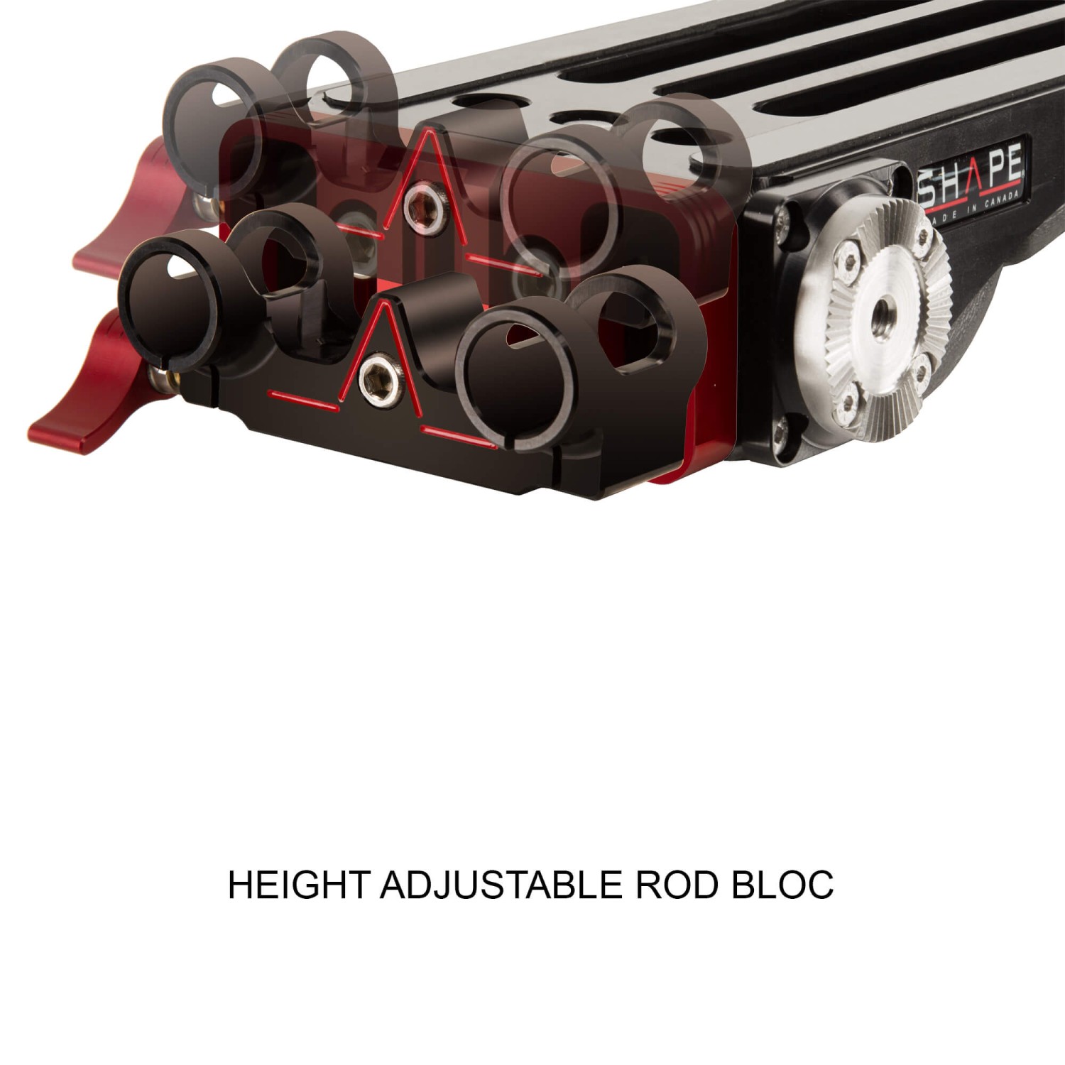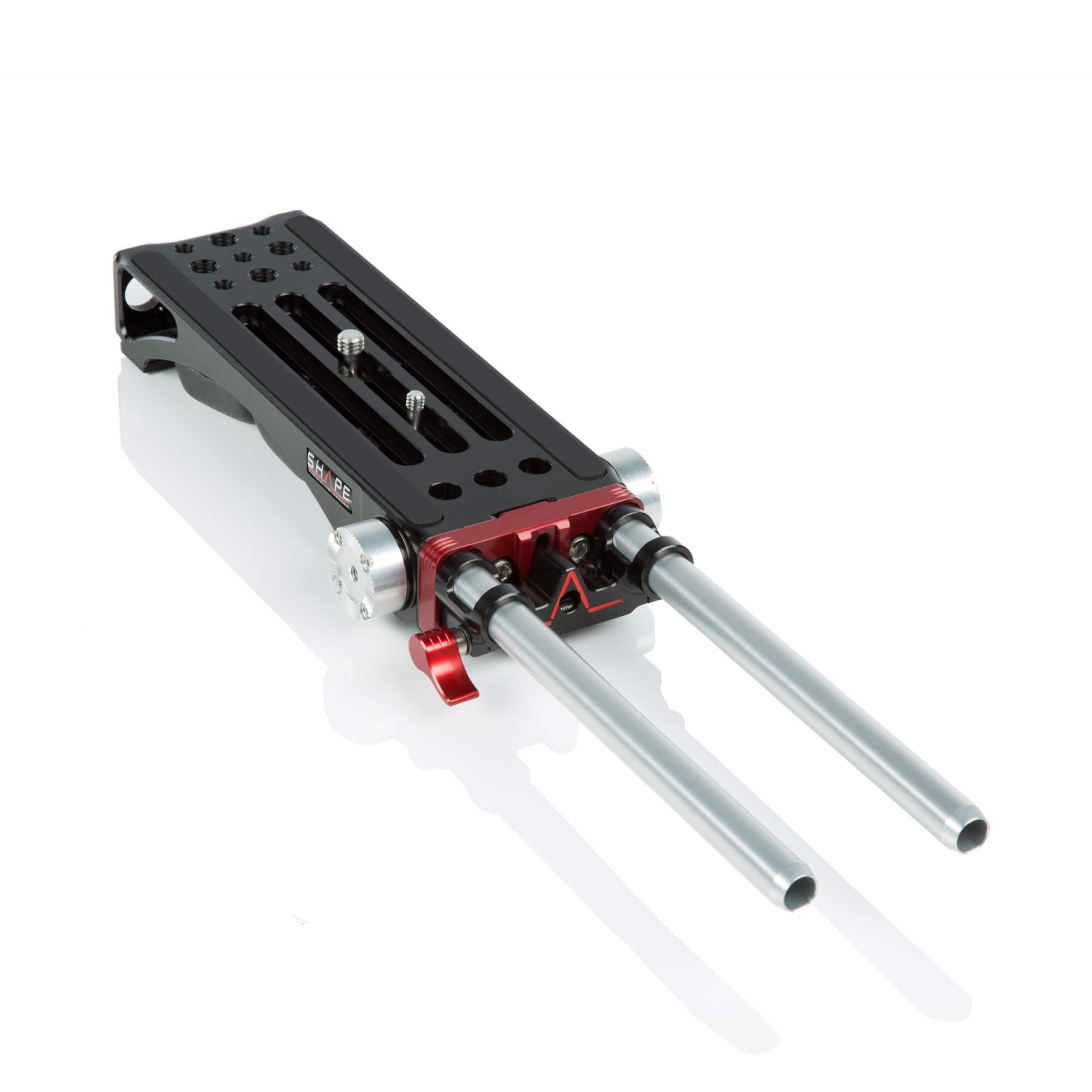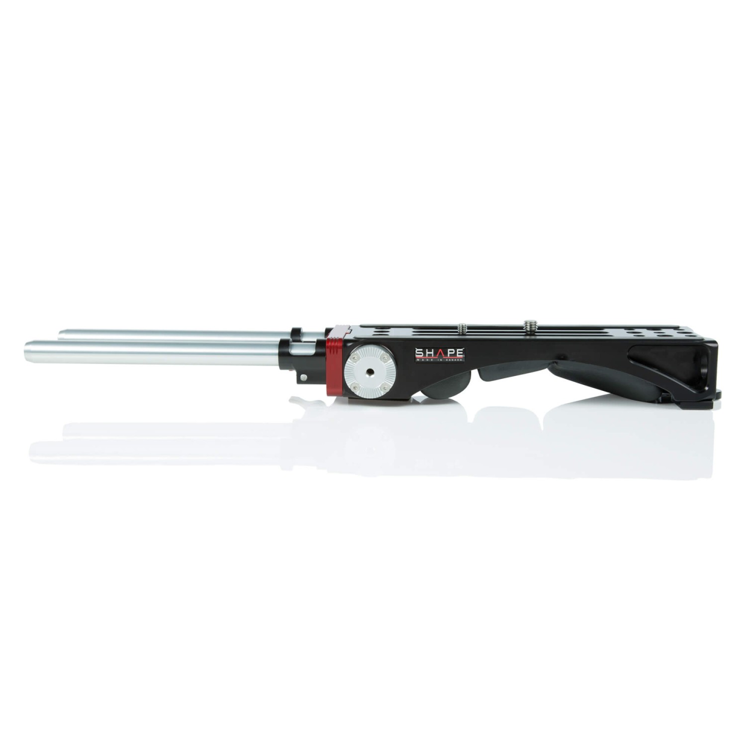 La plataforma del brazo se fija mediante cierres a presión. Las roscas para fijarla al trípode se encuentran debajo de la plataforma del brazo. Se incluye un par de barras de 15 mm (8″) para la parte delantera. Para fijar el matte box y otros accesorios, el adaptador de varillas se puede ajustar verticalmente si se retira el tornillo que lo mantiene en su sitio. Esta placa base también es compatible con los adaptadores opcionales SHAPE de 15 mm Studio y 19 mm Studio, que sustituyen al adaptador incluido. La placa base cuenta con tres orificios para la fijación de la cámara, compatibles con tornillos de 1/4″-20 y 3/8″-16. Las ranuras descentradas permiten montar la cámara desplazada si se utiliza el adaptador Studio de 15 mm. Detrás de las tres ranuras hay varias roscas de montaje de 1/4″-20 y 3/8″-16 para fijar brazos articulados y otros accesorios. El paquete incluye dos tornillos de 1/4″-20 y dos tornillos de 3/8″-16 para fijar la cámara.