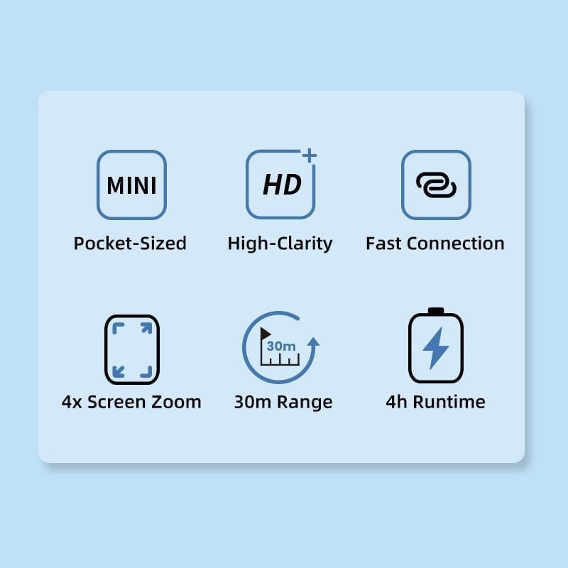 La Shimbol CP5 Mini2 Blue ofrece una solución sencilla y rápida para los creadores de contenido móvil. Gracias a su conexión inalámbrica instantánea con un solo toque, se empareja con los iPhone en cuestión de segundos, lo que te permite ver tus grabaciones sin complicadas configuraciones. Su pantalla HD de 2,4 pulgadas (480 × 800) ofrece una imagen nítida y brillante, y el zoom inteligente con un solo clic amplía la imagen sin cambiar la relación de aspecto, lo que mantiene un encuadre preciso. Con un peso de tan solo 60 g, pasa desapercibido en el encuadre y no molesta.