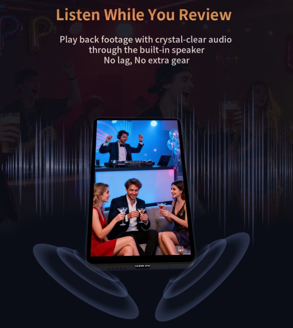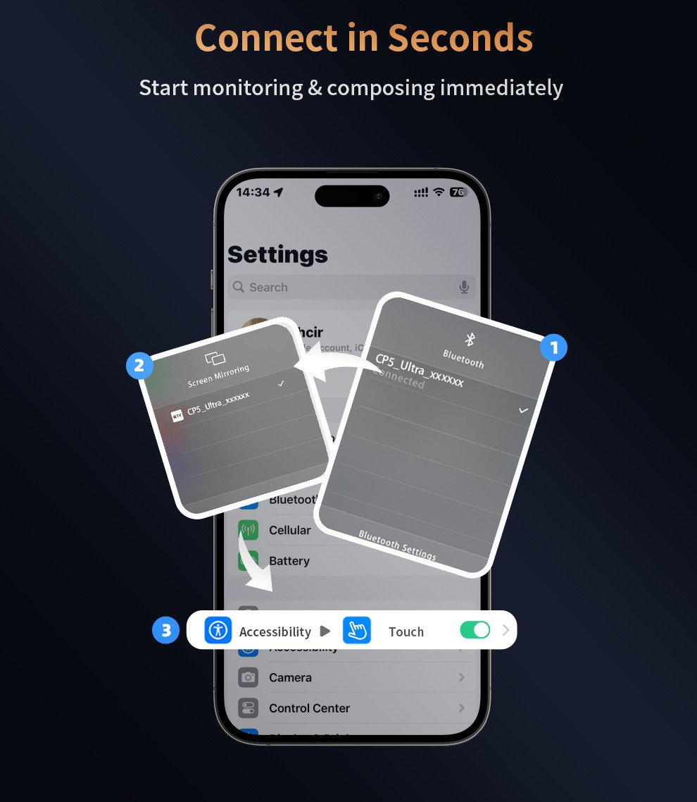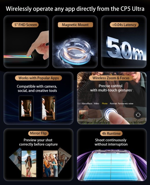 La CP5 Ultra se caracteriza por una latencia casi nula (<0,04 s) y un largo alcance inalámbrico de 50 metros, lo que garantiza una respuesta en tiempo real en entornos abiertos. En combinación con aplicaciones compatibles, como Blackmagic Camera, ofrece una monitorización fluida en 4K con un rendimiento estable. La batería integrada de 2000 mAh proporciona hasta 4 horas de fotografía ininterrumpida, mientras que el soporte magnético permite una fijación rápida a trípodes y accesorios para una configuración flexible.