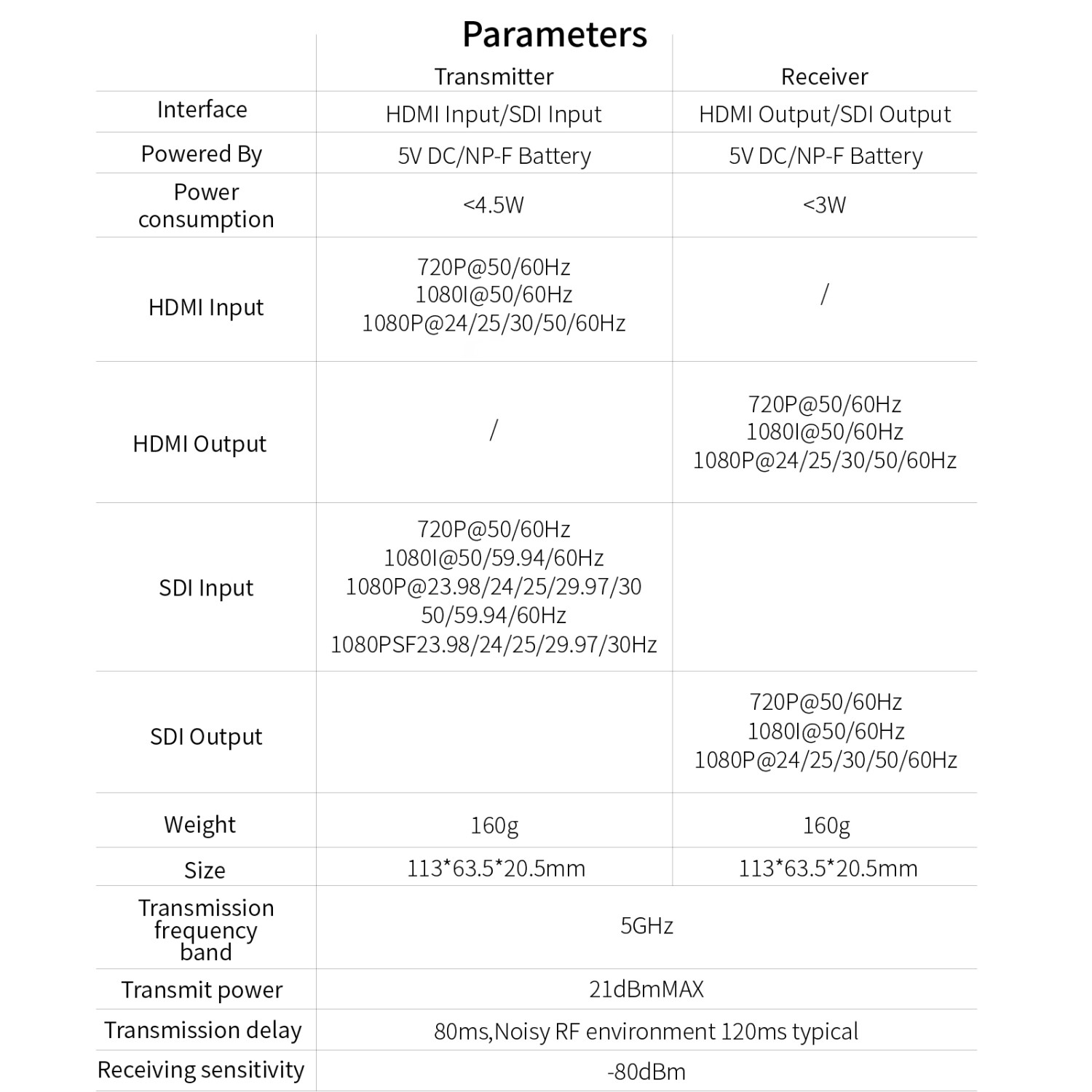 El conjunto de transmisor y receptor sirve para la transmisión inalámbrica de vídeo de hasta 1080p60 en la banda de 5 GHz a una distancia de aproximadamente 182 m (línea de visión directa) con una latencia de unos 80 ms. El sistema ofrece E/S HDMI y HD-SDI (el transmisor cuenta con 1 entrada HDMI tipo A y 1 entrada HD-SDI, mientras que el receptor cuenta con 1 salida HDMI tipo A y 1 salida HD-SDI), alimentación a través del puerto USB-C (o mediante una batería Sony de la serie L; no incluida) y la posibilidad de recibir la señal no solo mediante el receptor, sino también a través de teléfonos y tabletas. Ambas unidades cuentan con refrigeración pasiva para un funcionamiento silencioso, antenas internas y pantallas OLED de estado de fácil lectura.