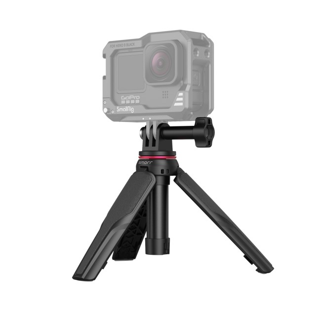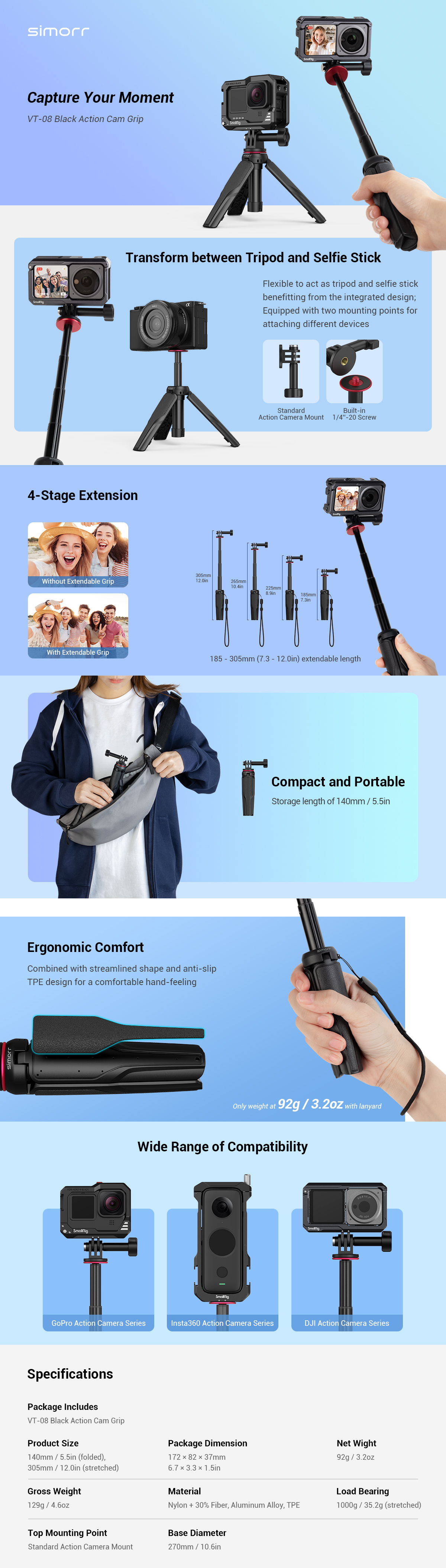 simorr VT-08 Action Cam Grip 3791. Los productos están fabricados con nailon, fibras, aleación de aluminio y otros materiales; son compactos y portátiles, a la vez que más estables y resistentes. El diseño integrado del trípode y el palo selfie permite cambiar fácilmente según las necesidades, y la parte superior utiliza conectores para cámaras de acción que son compatibles con marcas como Insta360, GoPro y DJI. El producto tiene un tamaño de almacenamiento de 14 cm, una longitud máxima extendida de 30,5 cm y pesa solo 92 g.
