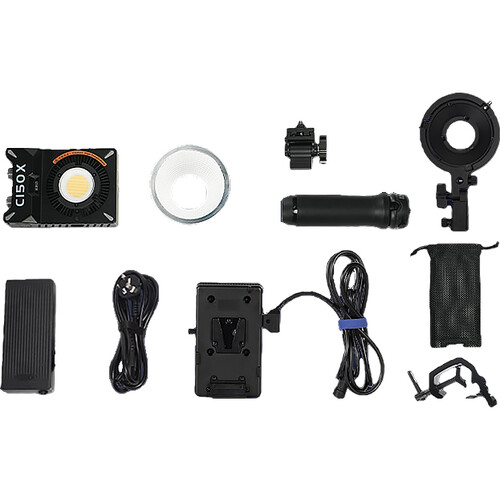 La luz está diseñada para ser portátil y se suministra con una placa de batería V-Mount, que ofrece la posibilidad de alimentarla con baterías para rodajes sobre el terreno o mediante alimentación de red para configuraciones de estudio. El adaptador de montaje Bowens amplía la compatibilidad con una amplia gama de modificadores de luz, lo que la convierte en una opción versátil para configuraciones creativas.