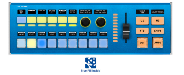 Una sección ME (Mix Effects) integrada incluye teclas de desplazamiento multinivel y teclas de usuario, lo que permite un control avanzado sobre flujos de trabajo de conmutación complejos. Con «Blue Pill Inside», la unidad incorpora el potente hardware de procesamiento de SKAARHOJ directamente en el controlador, ejecutando skaarOS para una integración y control perfectos del dispositivo sin necesidad de módulos externos.
