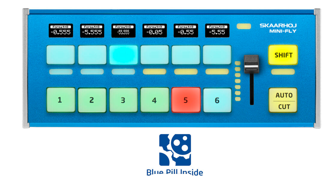 El SKAARHOJ Mini Fly Controller con Blue Pill integrado es un mezclador compacto para producciones en directo diseñado para pequeñas configuraciones multicámara. Con botones programables de cuatro direcciones con pantallas OLED, retroalimentación RGB y tecnología Blue Pill integrada, ofrece un control flexible, monitorización de audio y gestión de transiciones en un formato muy portátil.