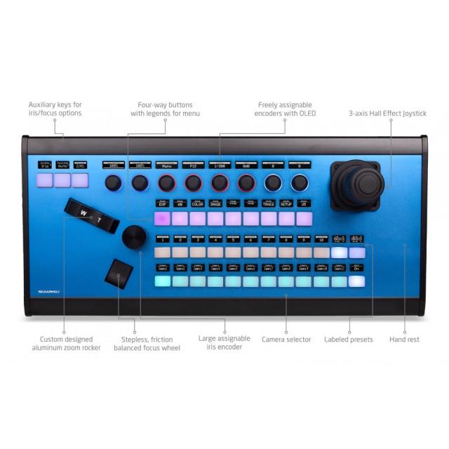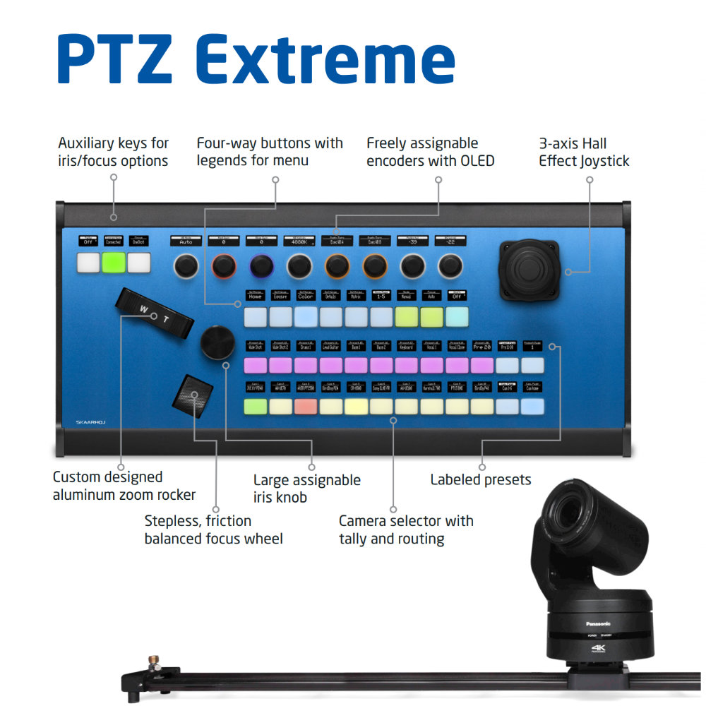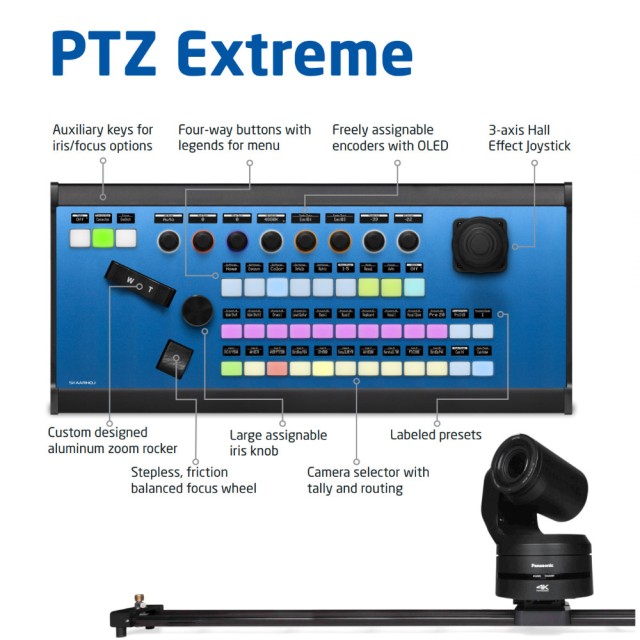 El PTZ Extreme con Blue Pill Inside es el controlador perfecto para sistemas robóticos multieje. Se trata de nuestro controlador PTZ insignia, diseñado pensando en la libertad absoluta: los controles y botones están indicados mediante pantallas OLED, cuentan con una ergonomía optimizada, un joystick con efecto Hall, una palanca de zoom independiente y una rueda de enfoque.
