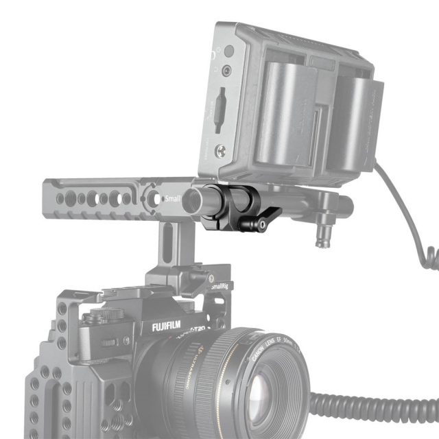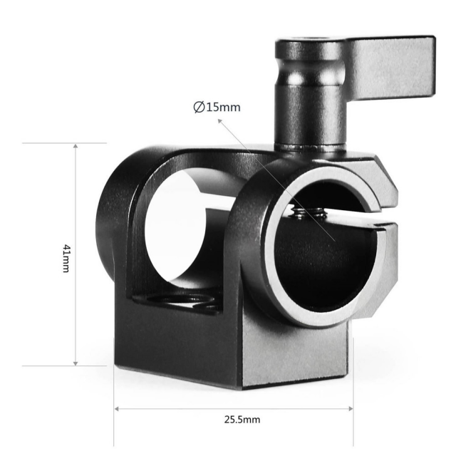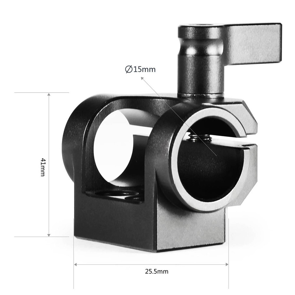 La abrazadera para barra de 15 mm 1995 de SmallRig cuenta con dos orificios con contrapiesta y un orificio roscado de 1/4''. Se puede fijar a las empuñaduras SmallRig 1955 mediante dos tornillos M4 y es compatible con la barra de 15 mm para el soporte de micrófono 1802. En otros casos, funciona con la barra de 15 mm para el Single RailBlock 860 o la Mini Mounting Plate 1906 y, por lo tanto, con monitores. El orificio roscado de 1/4'' se puede utilizar para accesorios de bricolaje.