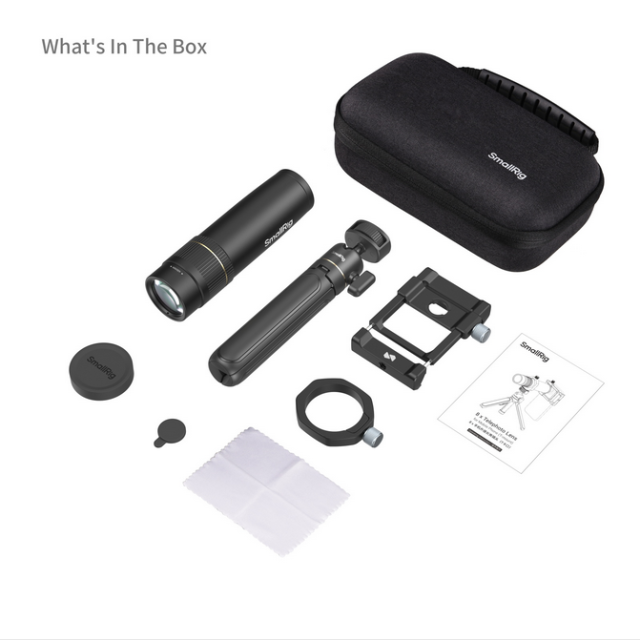 La instalación es sencilla gracias a la montura T estándar, por lo que es compatible con diversos dispositivos móviles. Para que tengas la seguridad de contar con todo lo necesario, el paquete incluye una pinza para el objetivo, un trípode, un adaptador, una tapa para el objetivo, un paño de limpieza y un manual de usuario, todo ello cómodamente guardado en una bolsa de almacenamiento para facilitar el acceso y la organización.