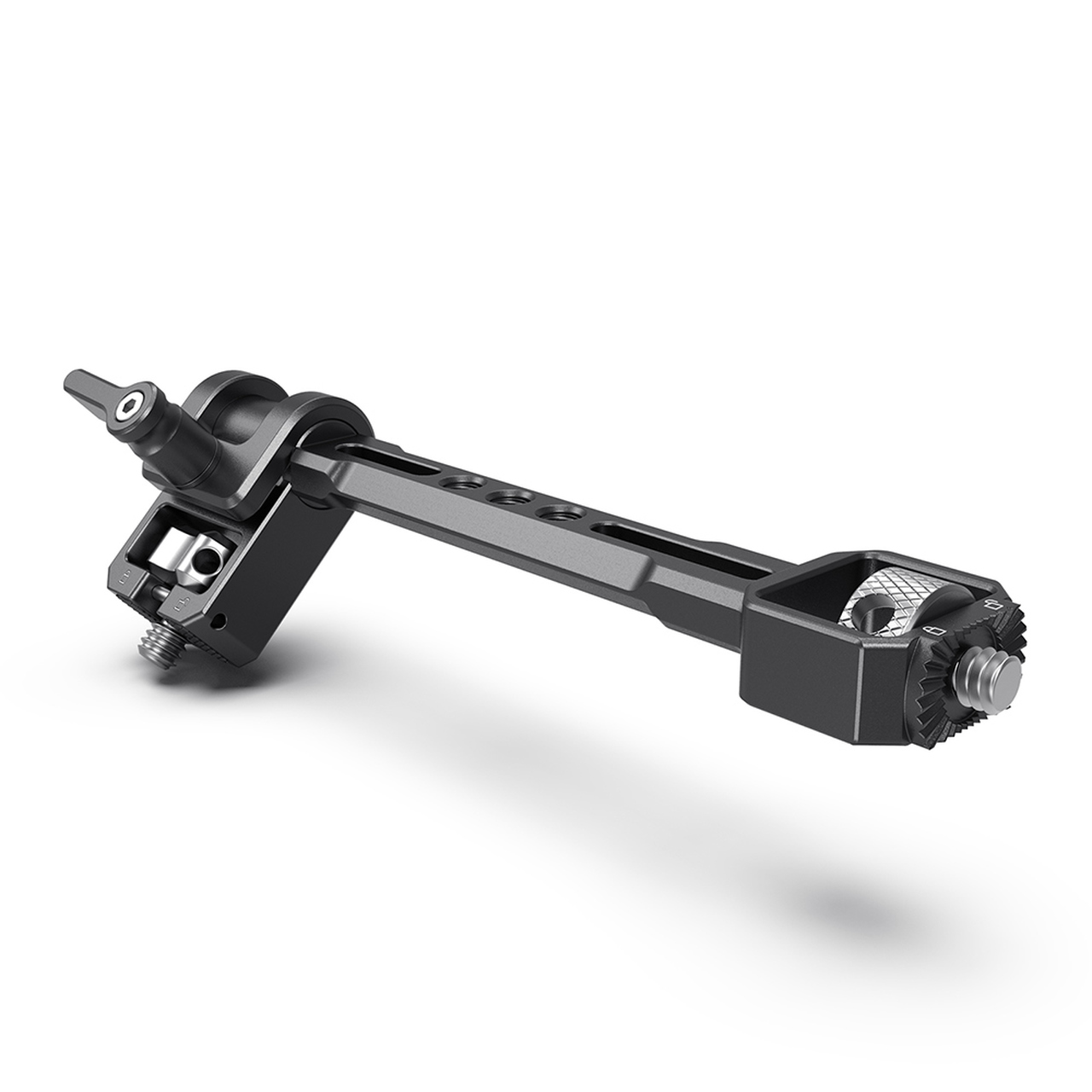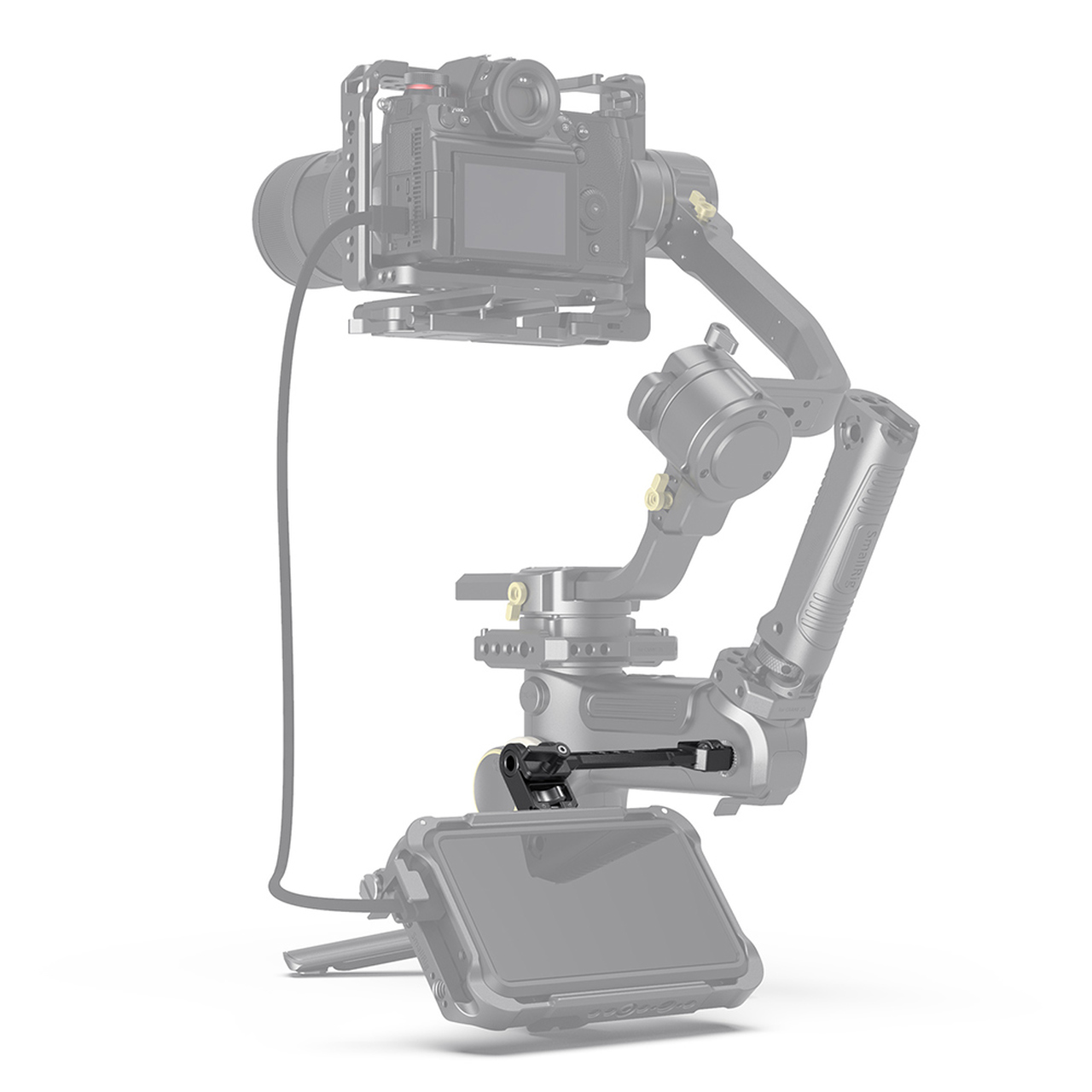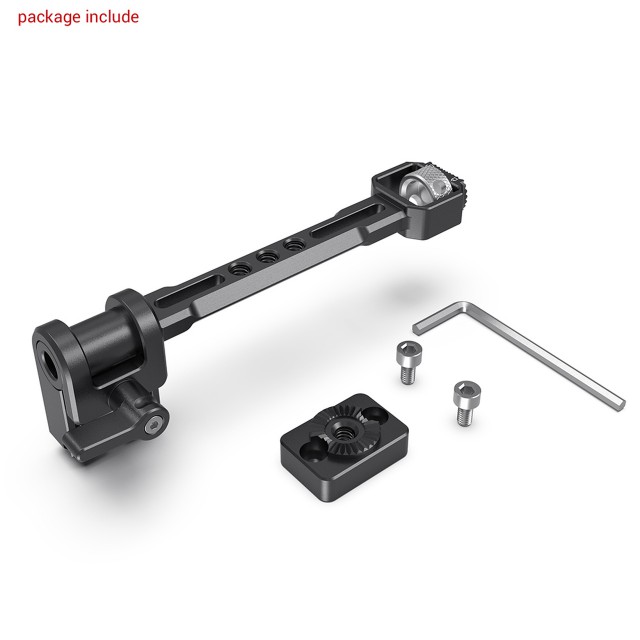 El soporte ajustable para monitor SmallRig para determinados estabilizadores de mano DJI, Zhiyun y Moza 2889 está diseñado para fijar el monitor y los accesorios a los estabilizadores. El soporte para monitor se fija al ZHIYUN CRANE 3/3S y al WEEBILL-S/LAB mediante un tornillo de 1/4"-20 y una roseta integrada que evita la torsión, y se fija al lateral del DJI Ronin-S/SC/RS 2/RSC 2 mediante una placa adaptadora con roseta. Está equipado con tres roscas de 1/4"-20 para otros accesorios, como el Cold Shoe 2260 para micrófono o receptor de audio. El soporte para monitor tiene un rango de inclinación de 360° y soporta un conjunto de monitor de hasta 2,2 kg.