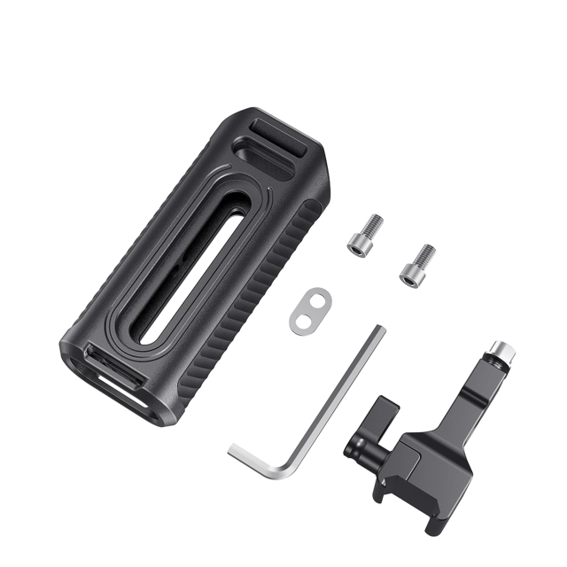 La empuñadura lateral de aluminio SmallRig NATO HSN2427 está diseñada para permitir a los camarógrafos grabar cómodamente a mano alzada. Mediante la llave hexagonal integrada en la parte inferior, la empuñadura se puede ajustar hacia arriba y hacia abajo según tus necesidades. Si desea utilizar la empuñadura en el otro lado de la jaula, retire la pieza metálica de unión de la empuñadura con la llave hexagonal y cambie la orientación. Se bloquea con una abrazadera NATO, por lo que se puede soltar rápidamente, y es compatible con cualquier jaula equipada con un riel NATO en el lateral. Se suministra con una zapata fría y tres orificios roscados de 1/4"-20 para montar accesorios. Pesa solo 237 g y cuenta con un cuerpo de aluminio con superficie de gel de silicona antideslizante, lo que garantiza un disparo cómodo y sencillo a mano alzada. Para mayor seguridad, esta empuñadura también se puede utilizar con una correa de mano.