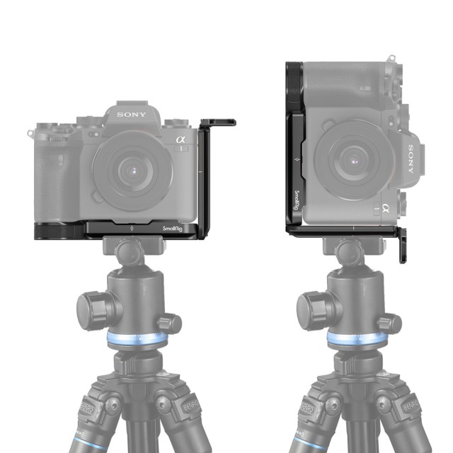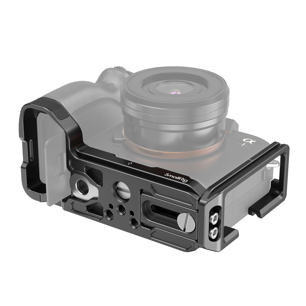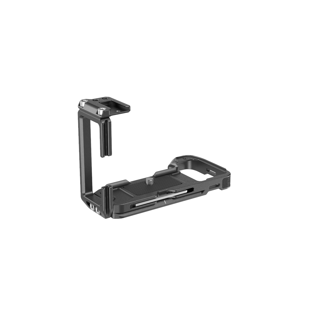El soporte SmallRig L para Sony A1, A7S III, A7R IV y A9 II 3207 está especialmente diseñado para cambiar rápidamente entre la orientación vertical y horizontal y para ofrecer un mejor agarre. La cámara se fija mediante un tornillo de 1/4"-20 en la parte inferior y la placa base cuenta con almohadillas de goma que evitan arañazos y deformaciones. Tanto la placa base como la placa lateral cumplen con los estándares Arca-Swiss y cuentan con marcas centrales. La placa lateral se puede deslizar hacia la izquierda si se necesita más espacio para conectar o liberar un cable, y se puede desplazar hacia delante para poder utilizar la pantalla abatible.