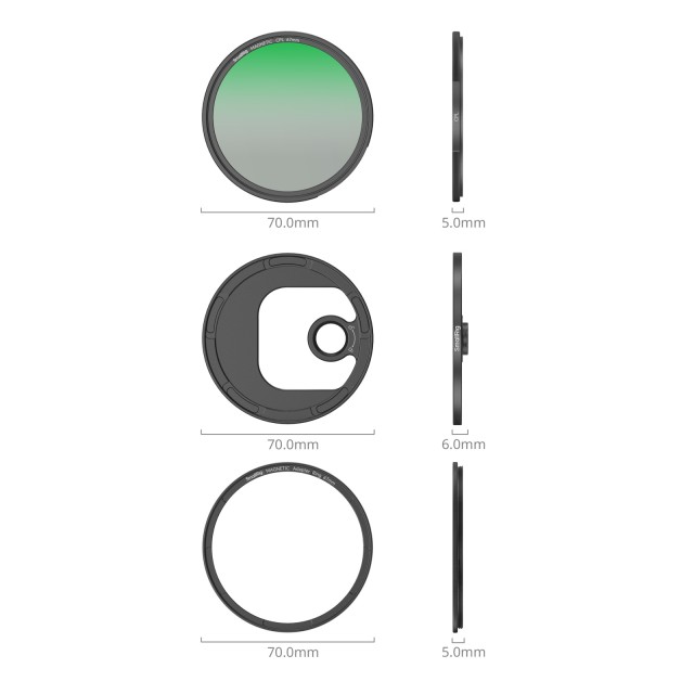Filtro acoplable SmallRig CPL con adaptador para fijación de filtro T-mount (67 mm) 4728 El uso de un filtro polarizador y su ajuste al ángulo adecuado permite minimizar eficazmente los reflejos en el agua, el cristal y los objetos inmóviles. El cristal óptico multicapa ofrece una calidad óptica fiable. El sistema de fijación magnético permite a los usuarios instalar y cambiar los filtros de forma rápida y eficaz. El kit incluye un anillo adaptador T-mount para la integración directa con la placa trasera T-mount de las fundas de la serie iPhone. El filtro, equipado con un anillo adaptador roscado, se puede acoplar a un objetivo de cámara de 67 mm, lo que proporciona una cómoda instalación magnética de los filtros para objetivos de cámara.