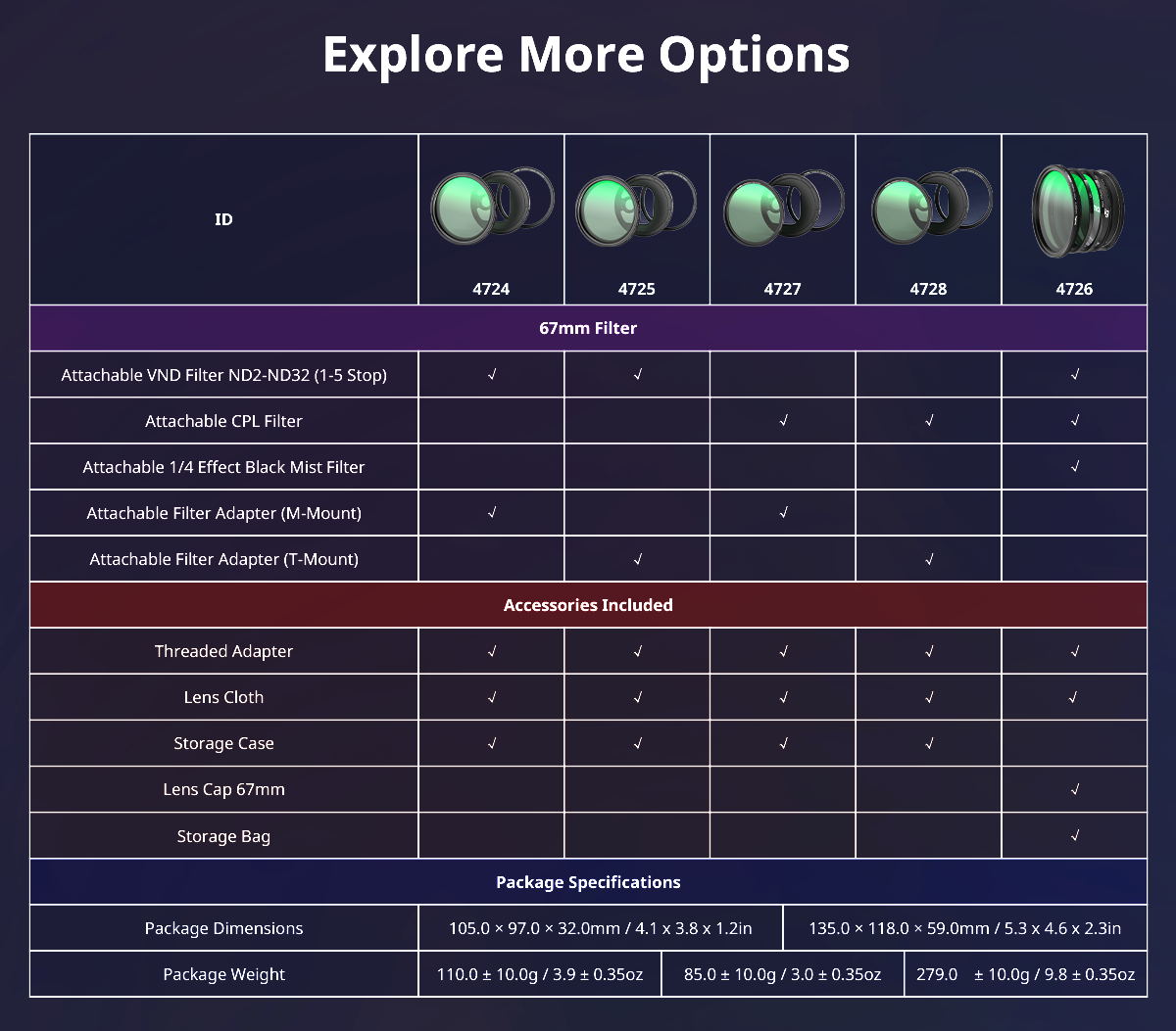 1. El filtro VND ofrece 5 niveles de efectos de reducción de luz ajustables, que proporcionan una configuración óptima de la exposición para grabar vídeos y crear imágenes con un desenfoque dinámico.