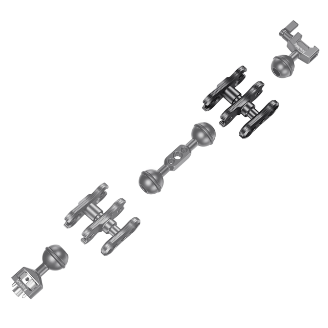 Esta abrazadera para rótula sirve de conector para dos componentes de las rótulas SmallRig (la rótula con tornillo de 1/4-20 2132, la rótula con abrazadera NATO 2133, la rótula con pasadores de posicionamiento Arri 2114 y la barra de extensión para rótula 2108). Para fijar firmemente la rótula doble se utiliza una sola tuerca de mariposa, que permite ajustar cómodamente los ángulos del brazo.