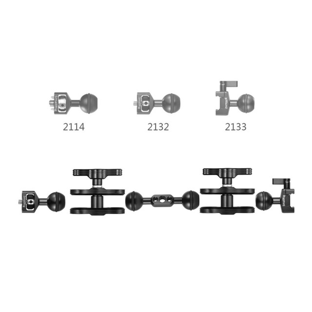 La rótula SmallRig con abrazadera NATO 2133, en combinación con la abrazadera SmallRig Ballhead Clamp 2134, puede utilizarse junto con otros accesorios de la rótula, como los modelos 2114, 2132…