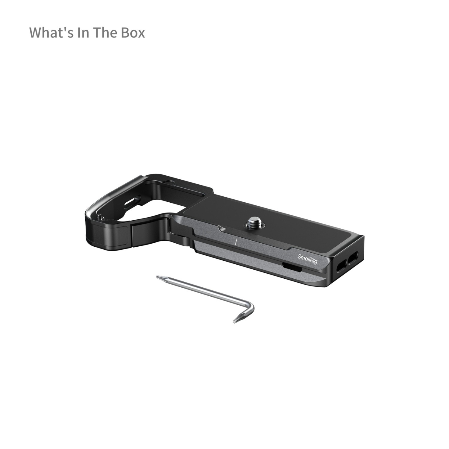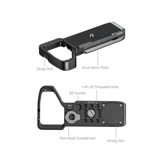 Se fija a la cámara mediante un tornillo de 1/4"-20 y cuenta con almohadillas protectoras que evitan arañazos y deformaciones. Esta placa de montaje cuenta con una ranura para AirTag, lo que permite fijar el dispositivo de seguimiento AirTag y realizar un seguimiento continuo de la cámara. Además, cuenta con un brazo articulado en el compartimento de las pilas, lo que mejora la ergonomía y proporciona apoyo para el meñique.