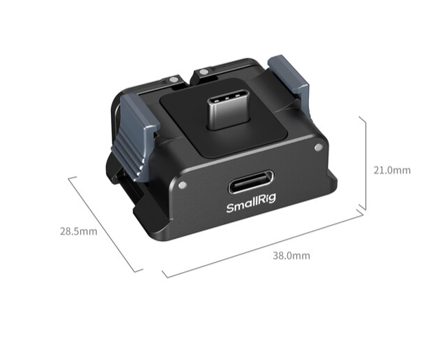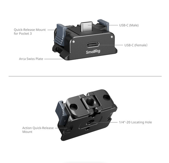Fija y alimenta tu DJI Osmo Pocket 3 con el adaptador de batería SmallRig, una base de aluminio ligera de 34 g con una abrazadera bipolar abatible, una placa de fijación rápida tipo Arca integrada, una rosca antirrotación de 1/4"-20 y un conector de carga USB-C pasante (macho-hembra) con acolchado de silicona para un agarre sin arañazos y un uso estable tanto en mano como en trípode.