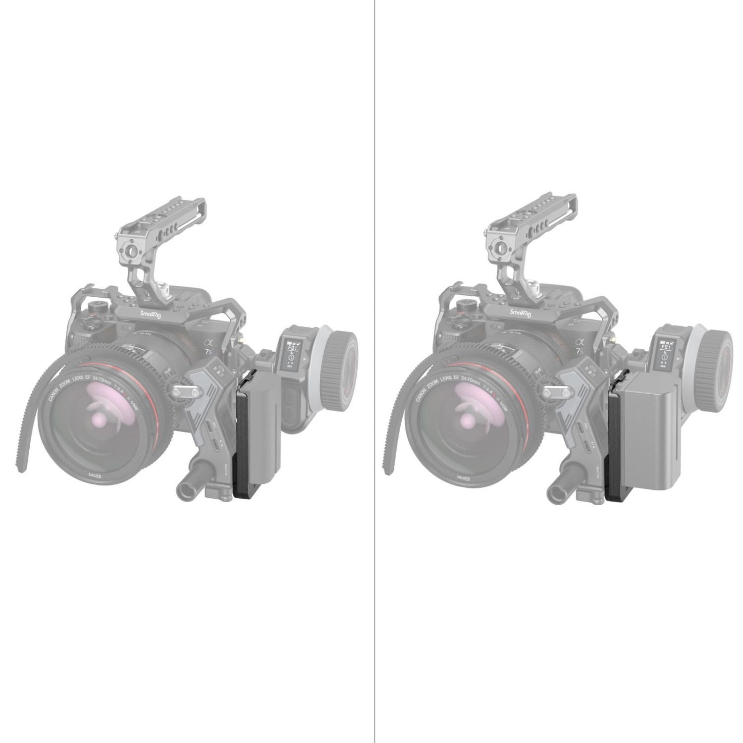 La placa de batería SmallRig 3777 es un accesorio de alimentación compatible con baterías NP-F que permite a los usuarios alimentar el motor inalámbrico del receptor y aumentar su par motor y su autonomía. La placa de batería de fijación rápida, que se puede bloquear y desmontar rápidamente, garantiza una fuente de energía estable. Al tratarse de un dispositivo «plug and play», se conecta al motor a través de contactos, por lo que no se necesitan cables.