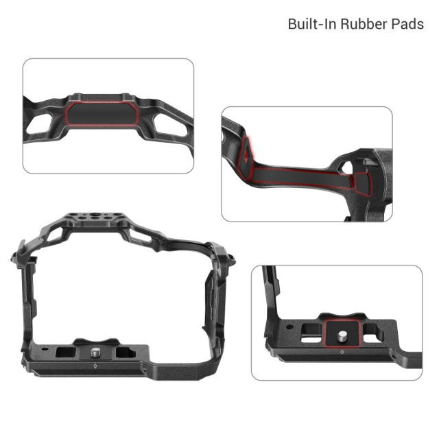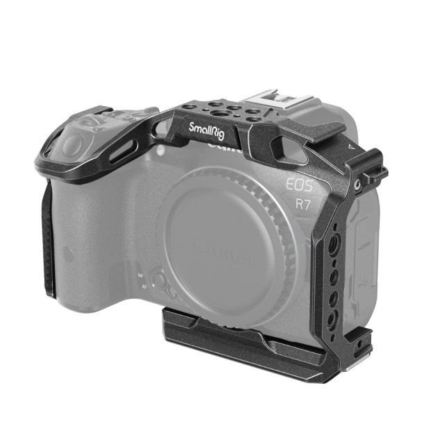La jaula SmallRig «Black Mamba» para la Canon EOS R7 4003 está diseñada para ofrecer protección y más puntos de fijación para accesorios. Esta jaula se fija con un tornillo de 1/4"-20 en la parte inferior y un adaptador de bloqueo lateral a cada lado, está equipada con almohadillas de silicona resistentes a los arañazos y presenta el diseño «Black Mamba», que permite un acceso completo a todos los controles de la cámara. También se suministra con orificios roscados de 1/4"-20 y orificios de posicionamiento ARRI de 3/8"-16 para los soportes laterales 2093 y 3814, los soportes superiores 3786 y 3765, el brazo mágico 2070, el soporte para monitor 2903, el soporte para batería externa portátil 2336, la abrazadera para barra 3598, etc.; soportes de zócalo frío para conectar micrófonos y luces LED, rieles NATO para las empuñaduras laterales 3260 y 3813, y orificios para la correa de mano 3848 y la correa de hombro para cámara PSC2428. La placa de liberación rápida Arca-Swiss en la parte inferior es compatible con el estabilizador DJI RS 2/RSC 2 y el trípode Arca-Swiss, lo que permite cambiar rápidamente entre el disparo a mano alzada, el estabilizador y el trípode. En la parte inferior hay un encaje QD integrado para conectar la correa de sujeción rápida. Además, el paquete incluye una llave reversible para facilitar el desmontaje.