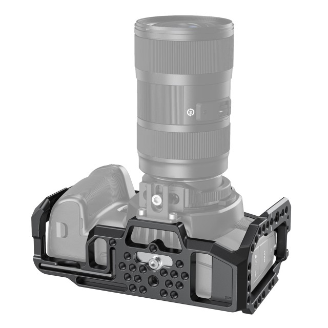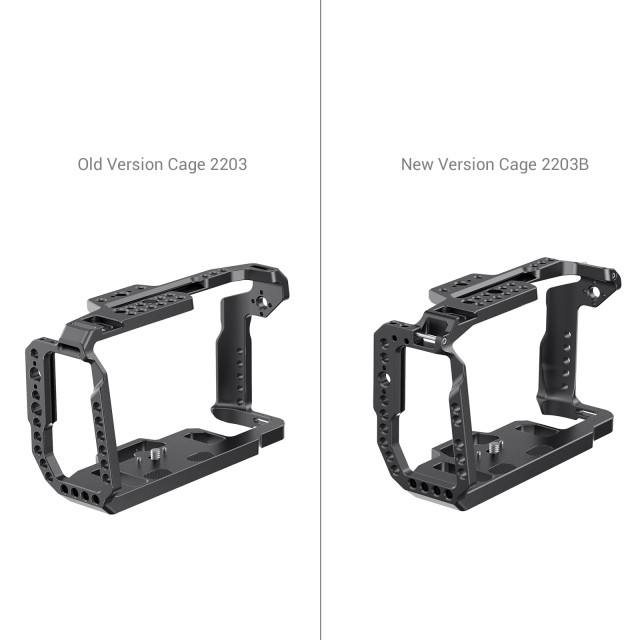 La jaula SmallRig para la Blackmagic Design Pocket Cinema Camera 4K y 6K 2203 es una jaula con un diseño adaptado a la forma de la cámara. Se fija de forma segura a la cámara mediante tornillos de 1/4''-20 en la parte superior e inferior, mientras que los pasadores de posicionamiento adicionales y las almohadillas de goma de la placa base evitan que se mueva o se raye. En la parte superior y en el lado izquierdo de la jaula hay rieles NATO integrados, a los que se puede acoplar el asa superior SmallRig NATO 1955 o el asa lateral de madera SmallRig NATO 2187 para grabar a mano alzada. Varios orificios con roscas de 1/4''-20 y 3/8''-16, así como orificios de fijación ARRI, están diseñados para fijar accesorios, como el brazo SmallRig Ballhead Arm 2070.