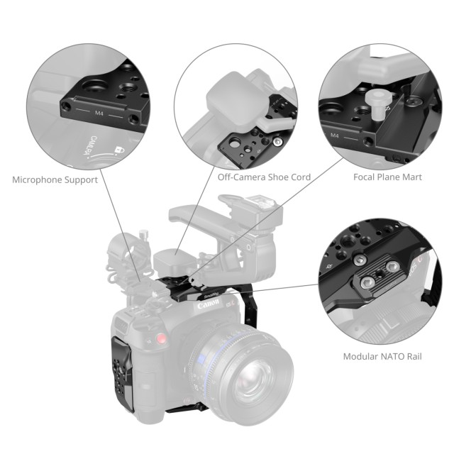 Este kit de jaula es compatible con soportes de micrófono Canon, ganchos para marcar el plano focal y cables de conexión externa a la cámara (OC-E4A). Además, el kit incluye una abrazadera para el cable HDMI que garantiza una transmisión de datos estable y una llave Allen magnética para facilitar el montaje y desmontaje.