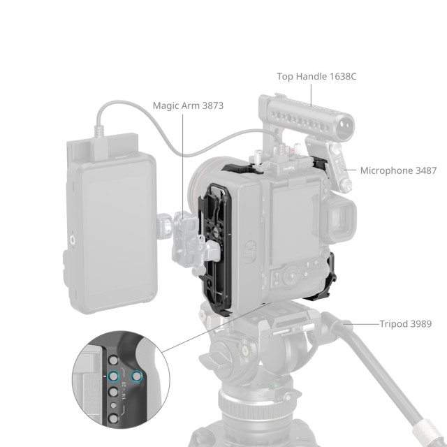 Está equipada con varios orificios roscados de 1/4"-20 y 3/8"-16, así como con orificios de fijación ARRI, y permite acoplar diversos accesorios, incluyendo soportes superiores (ID 4757, 3765) para un movimiento fluido de la cámara, soportes laterales (ID 4015, 4346), soportes para monitor (ID 2903B, 2904B) y brazos mágicos (ID 3873). Tres soportes para zapata fría permiten acoplar micrófonos (ID 3487) y luces LED (ID 4660).