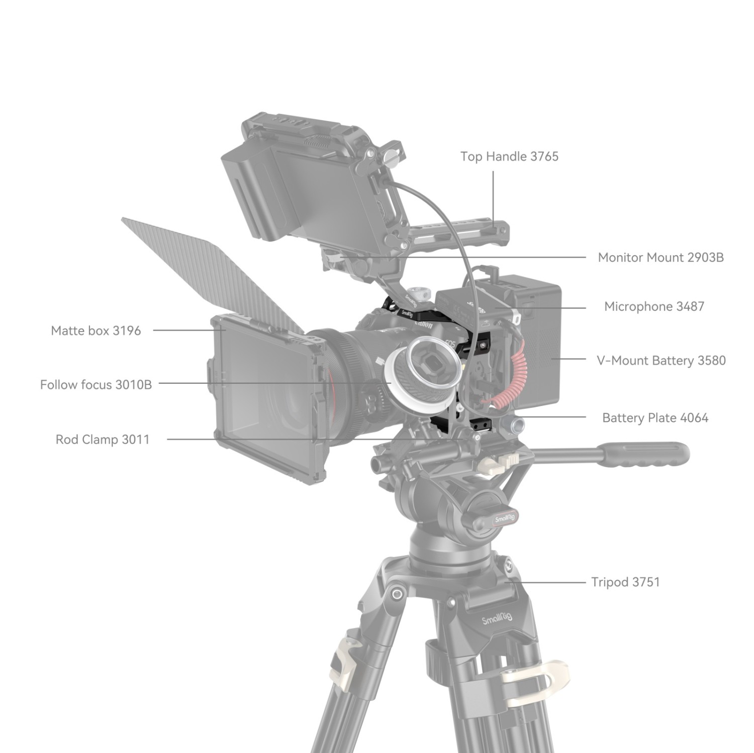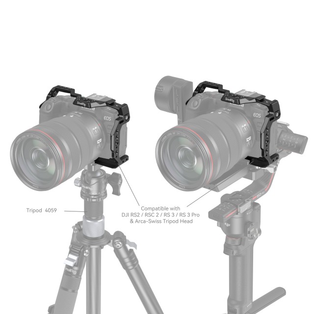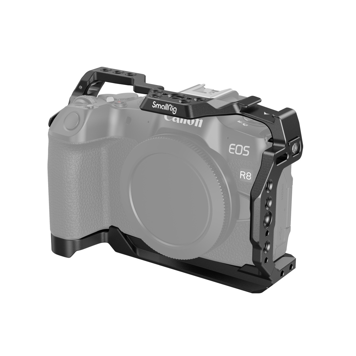 La jaula SmallRig para la Canon EOS R8 4212 está diseñada para proteger la cámara y fijar los accesorios. La jaula se fija mediante un tornillo inferior de 1/4"-20 y dos adaptadores de bloqueo laterales, está equipada con almohadillas de goma que evitan los arañazos y permite un acceso completo a los botones, las ranuras para tarjetas, la pantalla abatible y el compartimento de la batería. Entre sus puntos de fijación para accesorios se encuentran orificios roscados de 1/4"-20, orificios roscados de 3/8"-16 y orificios de posicionamiento ARRI de 3/8"-16, que admiten la empuñadura superior 3765, la empuñadura lateral 2093C, el soporte para monitor 2903B y el brazo Magic Arm 3875; el soporte superior de zapata fría sujeta el micrófono 3468 y la luz LED de vídeo 3286B; y la barra NATO izquierda es compatible con las empuñaduras laterales giratorias 3260 y 3813.
