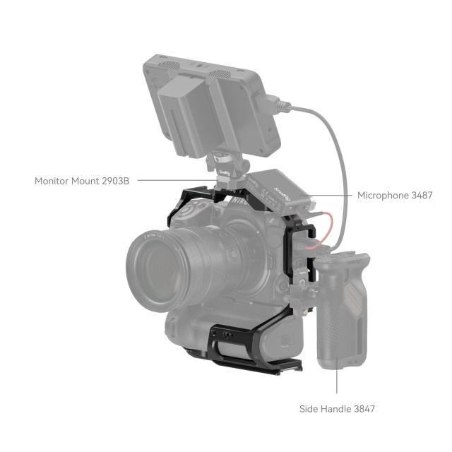 La jaula SmallRig para la Nikon Z 8 con empuñadura de batería MB-N12 3982 está diseñada para proteger la cámara y fijar los accesorios. Fija la cámara mediante un tornillo inferior de 1/4"-20 y un tornillo M2,5 a cada lado, con arandelas de goma que evitan los arañazos, y permite un acceso completo a los botones, las ranuras para tarjetas, el compartimento de la batería y la pantalla abatible. Entre los puntos de fijación para accesorios se incluyen orificios roscados de 1/4"-20 y 3/8"-16 y un orificio de posicionamiento ARRI de 3/8"-16, que admiten las empuñaduras superiores 2165 y 1638, las empuñaduras laterales 2093 y 2425, los soportes para monitor 2903 y 2904 y el brazo Magic Arm 3875; dos soportes Cold Shoe son aptos para micrófonos y luces LED de vídeo; y la placa inferior de fijación rápida y la placa lateral Arca Swiss permiten el disparo horizontal y vertical en trípodes. La placa inferior de fijación rápida Arca-Swiss también es compatible con los gimbals DJI RS 2 / RSC 2 / RS 3 / RS 3 Pro para cambiar rápidamente entre los modos de captura manual, gimbal y trípode. En la parte frontal hay dos orificios roscados de 1/4"-20 para la abrazadera de varilla doble de 15 mm 942, la caja mate y el soporte para el objetivo; y un orificio de posicionamiento de 1/4"-20 para la abrazadera de varilla simple 3276 para el seguidor de enfoque. Además, el paquete incluye una llave magnética de doble cara para facilitar el desmontaje y el montaje.