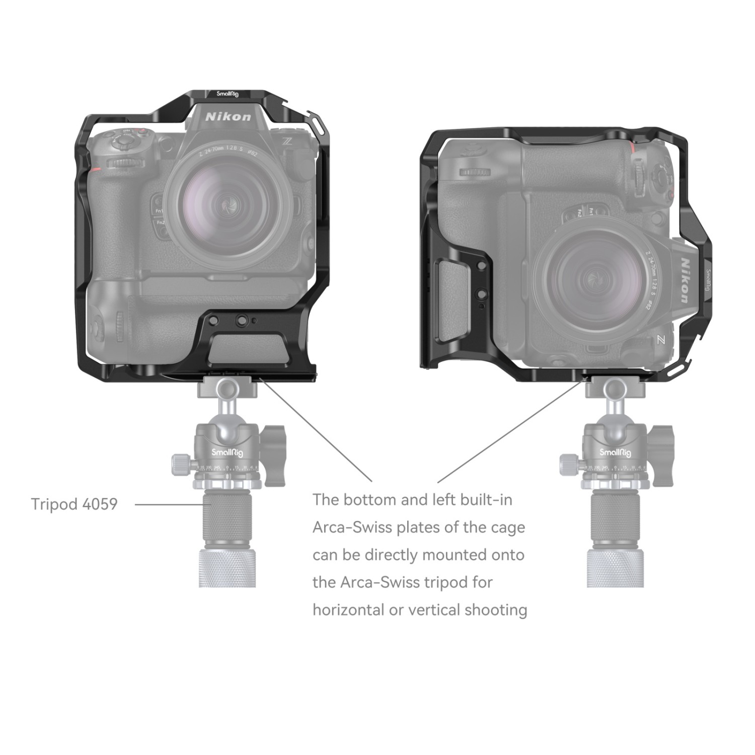 3. Placa inferior de fijación rápida y placa lateral Arca-Swiss para cambiar rápidamente entre la orientación horizontal y vertical.