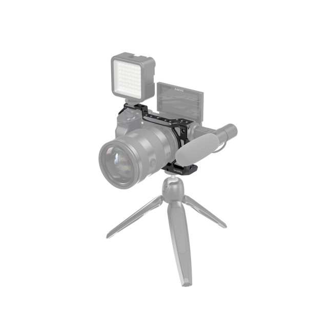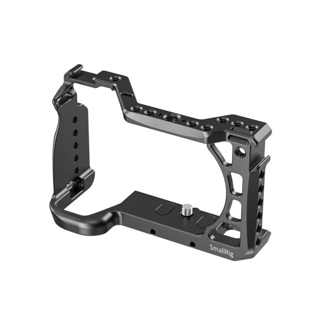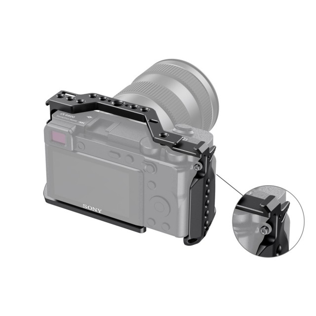 La jaula SmallRig para Sony A6600 CCS2493 está diseñada para ofrecer protección y roscas de montaje para accesorios como monitores, micrófonos, luces y empuñaduras. La jaula se fija a la parte inferior de la cámara mediante un tornillo inferior de 1/4"-20 y un tornillo M2,5 para evitar que se tuerza. Está equipada con varios orificios para accesorios de 1/4"-20, 3/8"-16 y Arri 3/8"-16, que permiten montar la empuñadura superior 2165, el soporte para monitor 2294 y el soporte para monitor 2348.