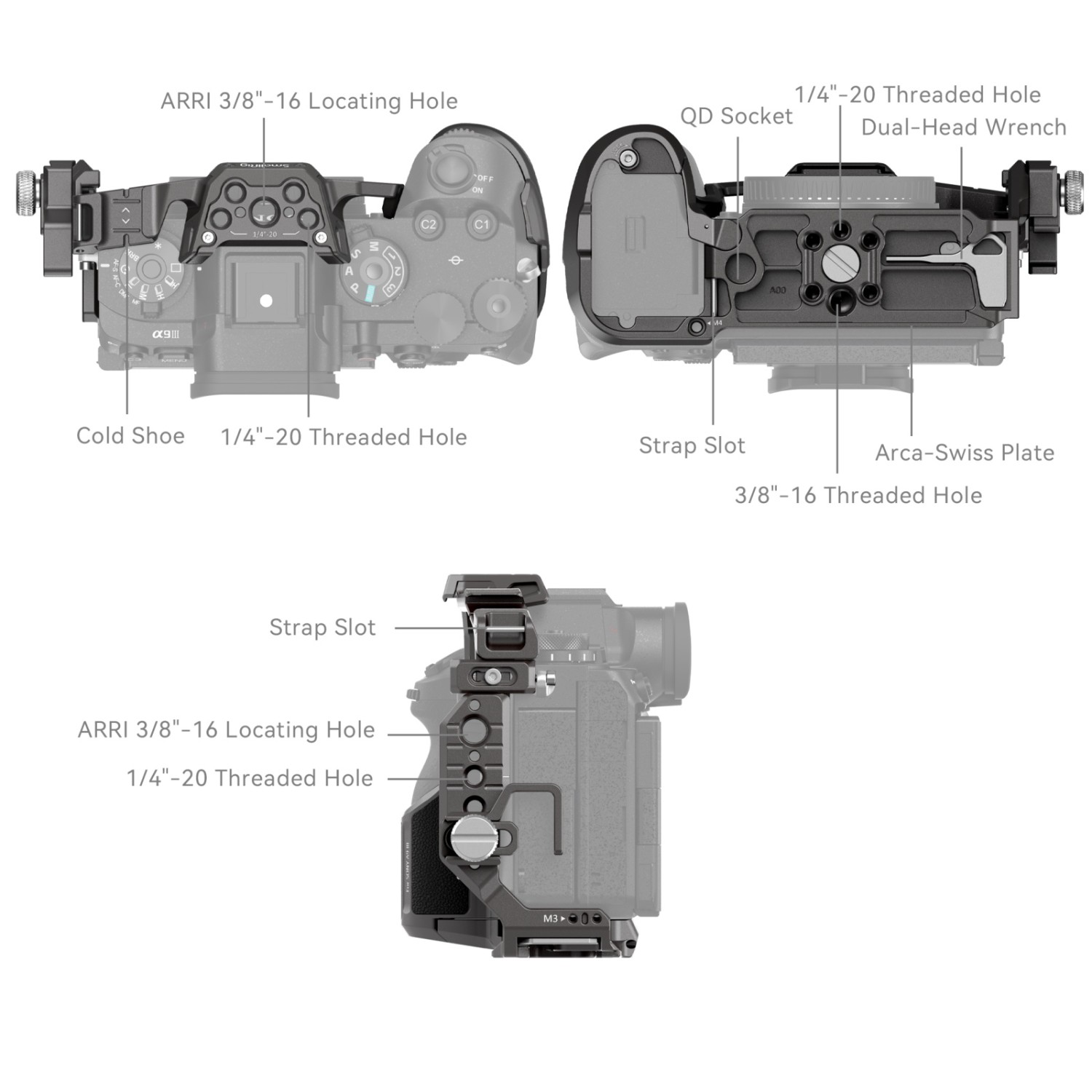 La jaula SmallRig para Sony Alpha 9 III 4533 está diseñada para proteger la cámara y permitir la ampliación con accesorios. El sistema de fijación de tres puntos contra el desplazamiento sujeta firmemente la Alpha 9 III mediante pasadores de posicionamiento, un tornillo de 1/4"-20 en la parte inferior y un tornillo M2,5 en el lado izquierdo. El diseño optimizado de la jaula garantiza un acceso sin obstáculos a los botones y ofrece un uso más cómodo. La abrazadera especial para cables HDMI «Rhinoceros» sujeta los cables mediante tornillos de pulgar, lo que protege los puertos HDMI y garantiza una transmisión de datos estable. Varias interfaces de montaje integradas incluyen orificios de 1/4"-20 y orificios de posicionamiento ARRI de 3/8"-16 para fijar el asa superior (ID: 2165C) o el asa lateral (ID: 4016), un orificio de posicionamiento ARRI de 3/8"-16 para la extensión del soporte del monitor (ID: 2903B), zapatas para micrófono o luz LED de vídeo, y una ranura QD para la correa de hombro QD. La placa de fijación rápida Arca-Swiss integrada en la parte inferior es compatible con DJI RS 2 / RSC 2 / RS 3 / RS 3 Pro, el estabilizador DJI RS 2 / RSC con placas de fijación rápida y la placa de fijación rápida Arca-Swiss (ID: 3154). Los orificios para correas en el lado izquierdo y en la parte inferior de la jaula son compatibles con la correa de mano (ID: 3848), la correa de hombro (ID: PSC2428) y otros accesorios. Además, la llave magnética situada en la parte inferior de la jaula es accesible en todo momento para facilitar el desmontaje y el montaje.