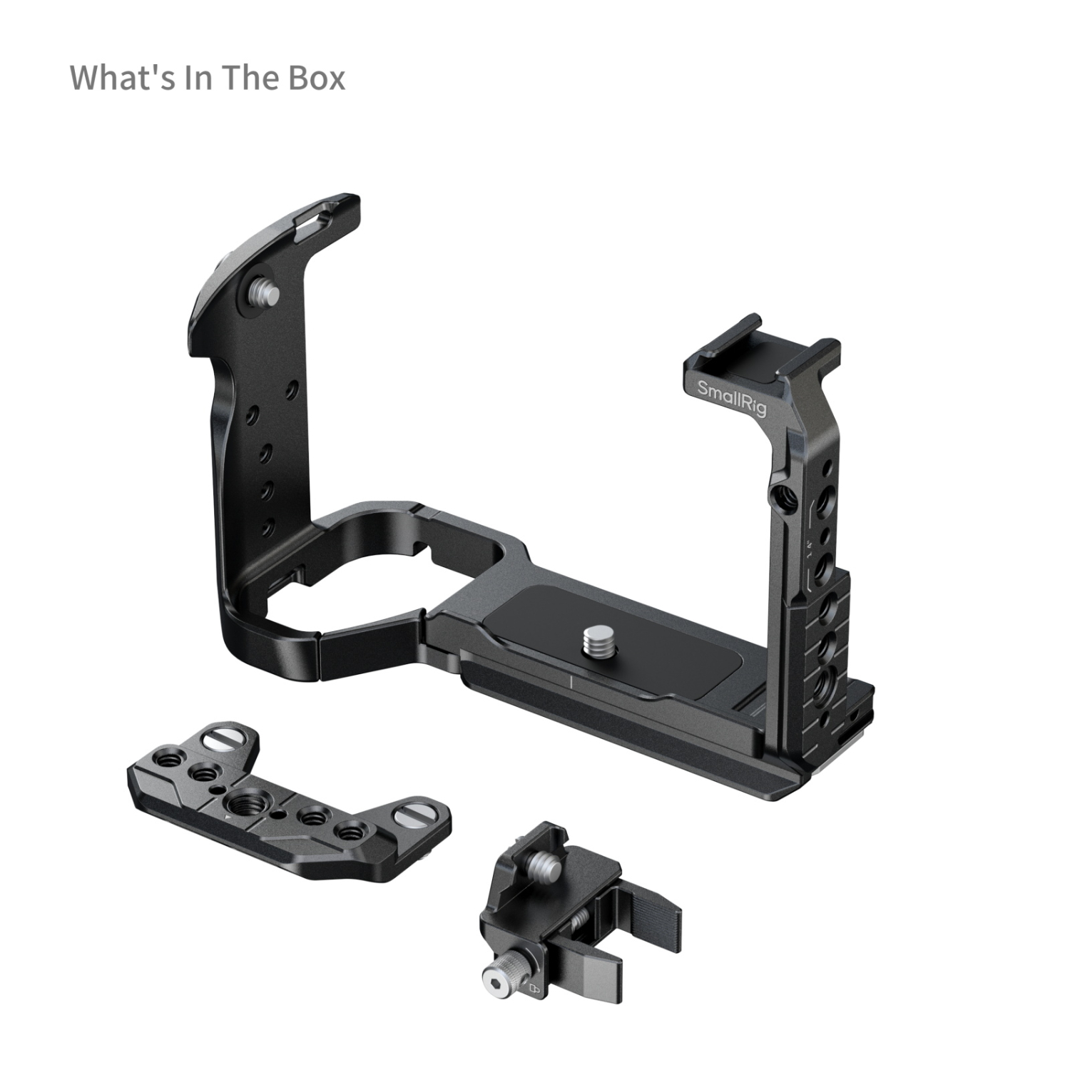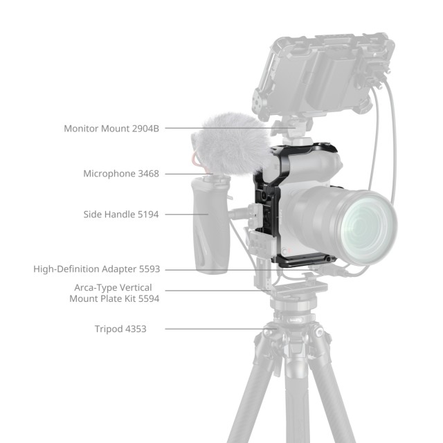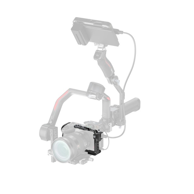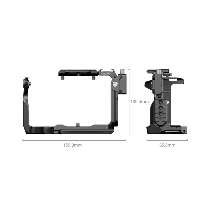 La placa superior extraíble está equipada con una guía NATO, a la que se puede acoplar la empuñadura superior Sony XLR o la empuñadura superior giratoria SmallRig (ID 4152) sin interferir con el EVF. La jaula incluye varios puntos de montaje, entre los que se encuentran orificios roscados de 1/4"-20, orificios de posicionamiento ARRI de 3/8"-16 y una guía NATO «HawkLock» para la fijación rápida de accesorios, como las empuñaduras laterales (ID 4485) y las empuñaduras superiores (ID 4483). El soporte para pies fríos permite fijar dispositivos como el DJI Mic 2 o luces LED, mientras que la ranura QD de la base admite correas de hombro para una mejor portabilidad. La base también está equipada con una llave Allen magnética que facilita el montaje y desmontaje rápidos.