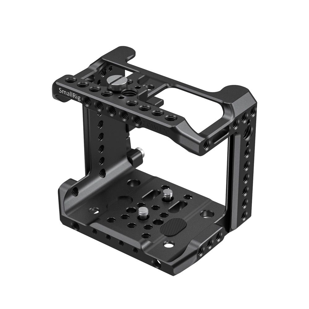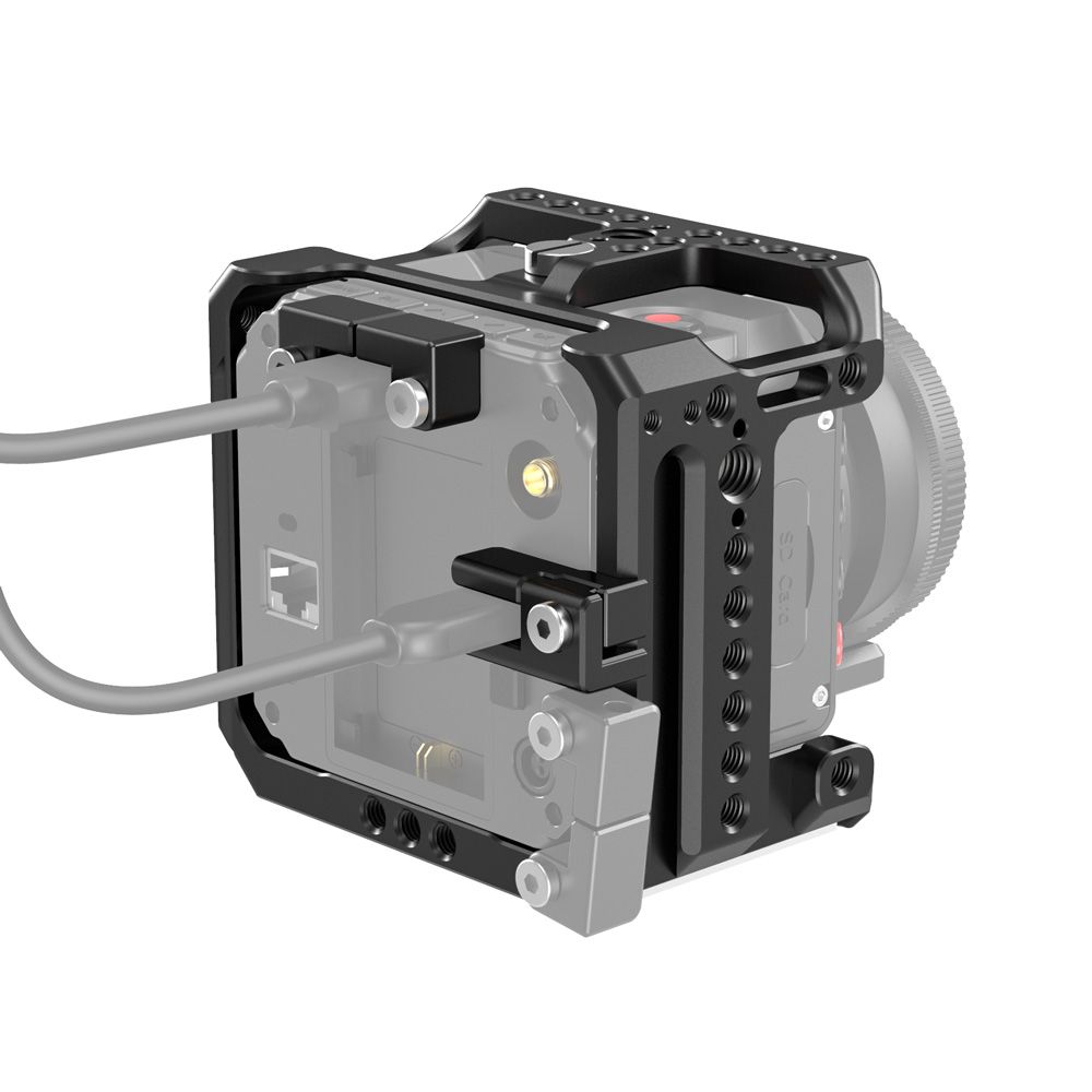 La jaula SmallRig para la Z CAM E2C CVZ2372 está diseñada para ofrecer protección y roscas de montaje para accesorios como monitores, micrófonos y empuñaduras. La jaula se fija a la cámara mediante tres tornillos de 1/4", uno en la parte superior y dos en la inferior, para evitar que se tuerza. Cuenta con varios orificios de posicionamiento de 1/4"-20 y Arri de 3/8" para fijar accesorios como el Cold Shoe 2260, la empuñadura superior 2165 y el soporte para monitor 2294. Ambos lados se integran con la barra Nato Handle 2187 y el Magic Arm 2116. Además, cuenta con orificios en la parte superior para la correa de transporte. En la parte inferior hay un destornillador plano y una llave hexagonal integrados para una instalación rápida. Según tus necesidades, hay disponible un soporte para adaptador de objetivo y una abrazadera para cables HDMI y USB.