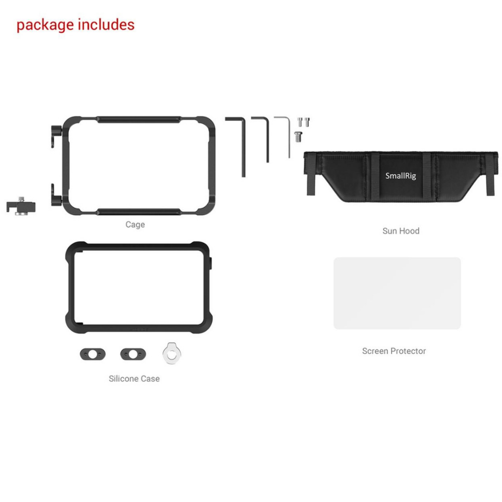 El kit SmallRig Cage Kit para Atomos Ninja V/Ninja V+ 3788 está diseñado para proporcionar una protección completa del monitor y la pantalla. La jaula 2209 cuenta con un riel NATO para los soportes de monitor Magic Arm 2071 y 2385; los orificios roscados de 1/4"-20 son compatibles con el soporte para monitor 2905 y el soporte Magic Arm 2070; los orificios de posicionamiento ARRI de 3/8"-16 permiten fijar el soporte para monitor 2903 y el soporte Magic Arm 2115. También incluye una abrazadera profesional para el cable HDMI que protege la interfaz y evita que se desconecte. El kit contiene una jaula 2209, un parasol 2269 capaz de bloquear la luz solar intensa, una funda de silicona (juego) 3448, que cuenta con latón ecológico que ayuda a disipar el calor, y está equipado con un protector de pantalla fácil de colocar que protege la pantalla del monitor contra huellas dactilares, agua, polvo, arañazos y golpes.