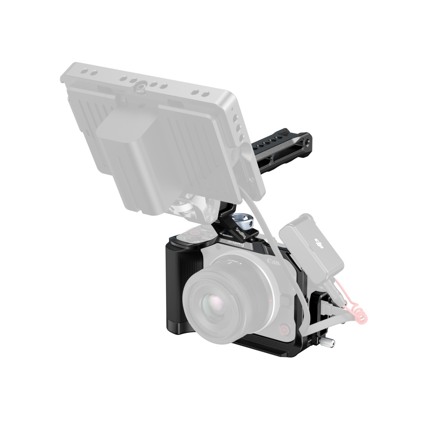 La placa Arca-Swiss integrada en la base es compatible con trípodes tipo Arca (ID 4059) y estabilizadores DJI RS, lo que permite cambiar rápidamente entre diferentes configuraciones. Está equipada con varias interfaces de expansión, incluyendo orificios integrados con rosca de 1/4"-20, orificios de posicionamiento, orificios de posicionamiento ARRI de 3/8"-16, soportes de pie frío, ranuras para correas y ranuras QD para fijar accesorios, como empuñaduras (ID 3765, 4015), micrófonos (ID 3468), lámparas de vídeo (ID 4660, 4786), correas para el hombro (ID 4882) y correas para la muñeca (ID 4881).