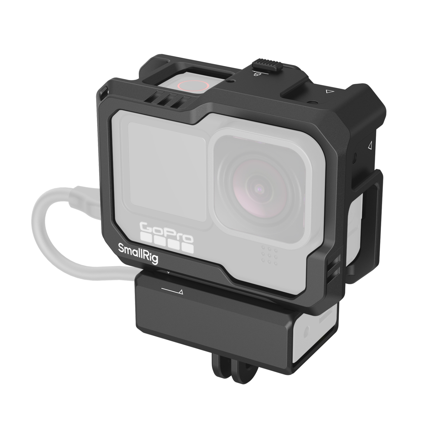 Esta carcasa moldeada está diseñada para ajustarse perfectamente a tu cámara GoPro sin obstaculizar su funcionalidad, incluida la compatibilidad con el cambio de lentes Max. En la parte inferior cuenta con un soporte de fijación rápida para el adaptador de audio que facilita el montaje y desmontaje de los accesorios de audio, mientras que la placa lateral de fijación rápida garantiza un fácil acceso al puerto USB-C para cargar o transferir datos sin necesidad de desmontar la carcasa.