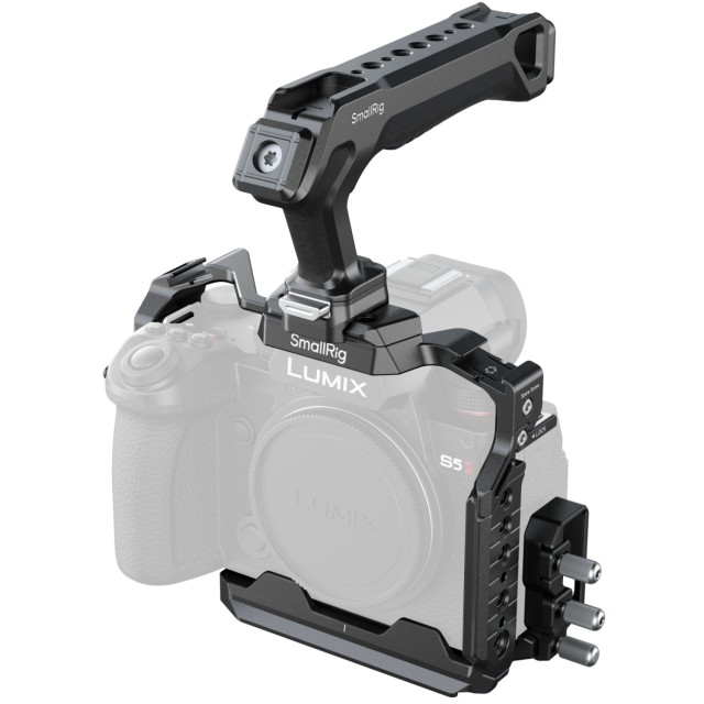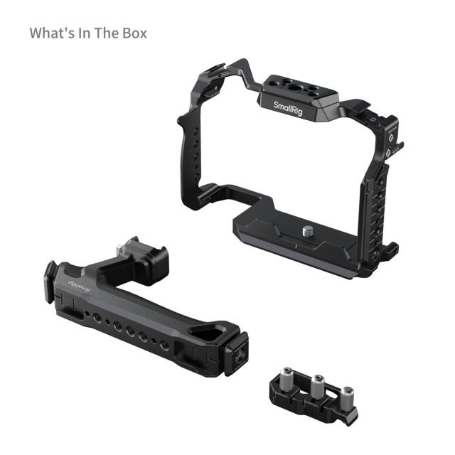 El kit SmallRig Cage Kit para Panasonic G9 II / S5 II / S5 IIX 5752 está diseñado para facilitar la grabación manual y la fijación de accesorios. Incluye una jaula, una abrazadera para cables HDMI y USB-C, y una empuñadura superior, diseñada ergonómicamente para un mejor agarre y que se acopla a la jaula mediante una abrazadera NATO. La abrazadera para cables, que se ajusta mediante un tornillo, permite fijar cables HDMI y USB-C al mismo tiempo. Entre los puntos de fijación de accesorios se incluyen orificios roscados de 1/4"-20, compatibles con el asa lateral 3323; soportes de zapata fría aptos para el soporte SSD 5196, micrófono, luz LED de vídeo, monitor, etc.; y orificios ARRI de 3/8"-16 aptos para el soporte de monitor 2903B. En el lado izquierdo también hay un riel HawkLock H21 NATO para el mango lateral 4485 y orificios para correa a ambos lados, compatibles con una correa de mano. Además, el paquete incluye una llave magnética para facilitar el desmontaje y el montaje.