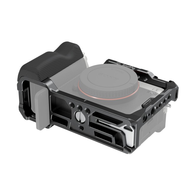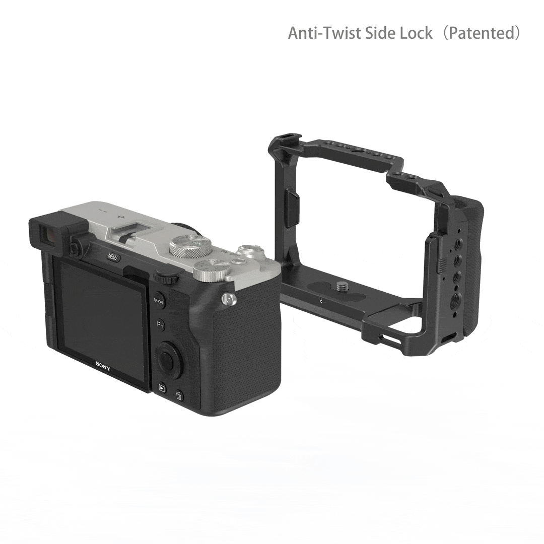 La jaula SmallRig con asa lateral para la cámara Sony A7C 3212 está diseñada para proporcionar puntos de montaje para accesorios, como monitores, micrófonos y luces LED, en grabaciones de vídeo profesionales. Se suministra con un asa de silicona integrada, diseñada ergonómicamente para mejorar la experiencia de sujeción. La jaula fija la cámara mediante un tornillo de 1/4"-20 en la parte inferior. Para evitar además que se tuerza, también puedes utilizar el cierre lateral derecho empujando el deslizador hacia arriba y fijando el pequeño tornillo incluido en el orificio para la correa de la cámara.