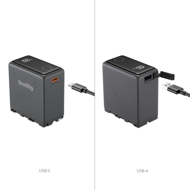Además de las funciones estándar de la NP-F970, este modelo también sirve como un powerbank de alto rendimiento. Está equipado con un puerto USB-C (entrada/salida) que admite carga rápida PD de 36 W, lo que permite una carga completa en aproximadamente 2 horas, y una salida USB-A (hasta 27 W). Los circuitos independientes permiten que los puertos USB-C y USB-A carguen rápidamente dos dispositivos al mismo tiempo (la salida combinada no supera los 54 W).