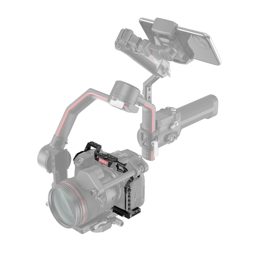 A la jaula se le puede acoplar el asa superior SmallRig 1984 o HTN2439, el asa lateral de madera SmallRig 2093 para el disparo a mano alzada y la abrazadera para cables SmallRig 2981, que protege los cables HDMI y USB-C. En la parte superior y lateral hay soportes tipo ARRI para fijar la empuñadura de posicionamiento SmallRig ARRI 2165 o el brazo mágico SmallRig Ball Head 2115. El paquete incluye orificios para correas, a través de los cuales se puede añadir al conjunto la correa de mano PAC2456, la PSW2398 o la correa para el cuello PSC2428, disponibles por separado. Además, en la parte inferior de la jaula hay un destornillador integrado para apretar el tornillo de la cámara. La jaula también cuenta con una placa de estilo Arca integrada en la parte inferior para