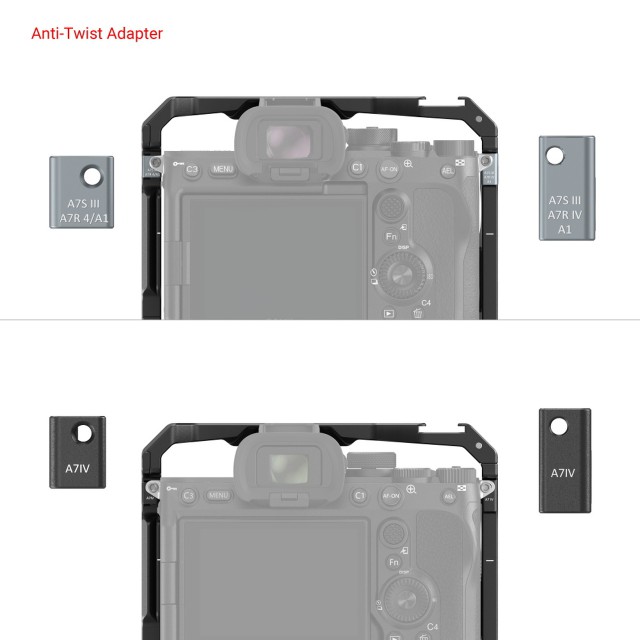 El soporte Cold Shoe de la parte superior admite micrófonos o luces LED, y la barra NATO del lado izquierdo es compatible con las empuñaduras NATO 2427 y 3260. Dos orificios roscados de 1/4''-20 en la parte inferior delantera admiten la abrazadera de varilla 1943 para matte box, follow focus, soporte de objetivo, etc. Uno de los orificios roscados delanteros incluye un pequeño orificio de posicionamiento adecuado para la abrazadera de varilla 3276 para follow focus. La placa de fijación rápida Arca permite cambiar rápidamente entre tomas con trípode y a mano alzada; los orificios inferiores con rosca de 1/4''-20 permiten montar la placa de fijación rápida DJI RS 2/RSC 2 (superior) mediante 2 tornillos para aumentar la estabilidad. Para las cámaras Sony A7 IV y A7S III, hay disponible por separado la abrazadera para cables 3000 opcional, que protege el puerto de cables y evita la desconexión de la señal. La jaula cuenta en su interior con varias almohadillas de goma que evitan los arañazos y se suministra con una llave magnética para facilitar su extracción e instalación. El paquete incluye cuatro adaptadores con cierre lateral, negros para la Sony A7 IV y gris plateado para las Sony A7S III, A7R IV y A1.