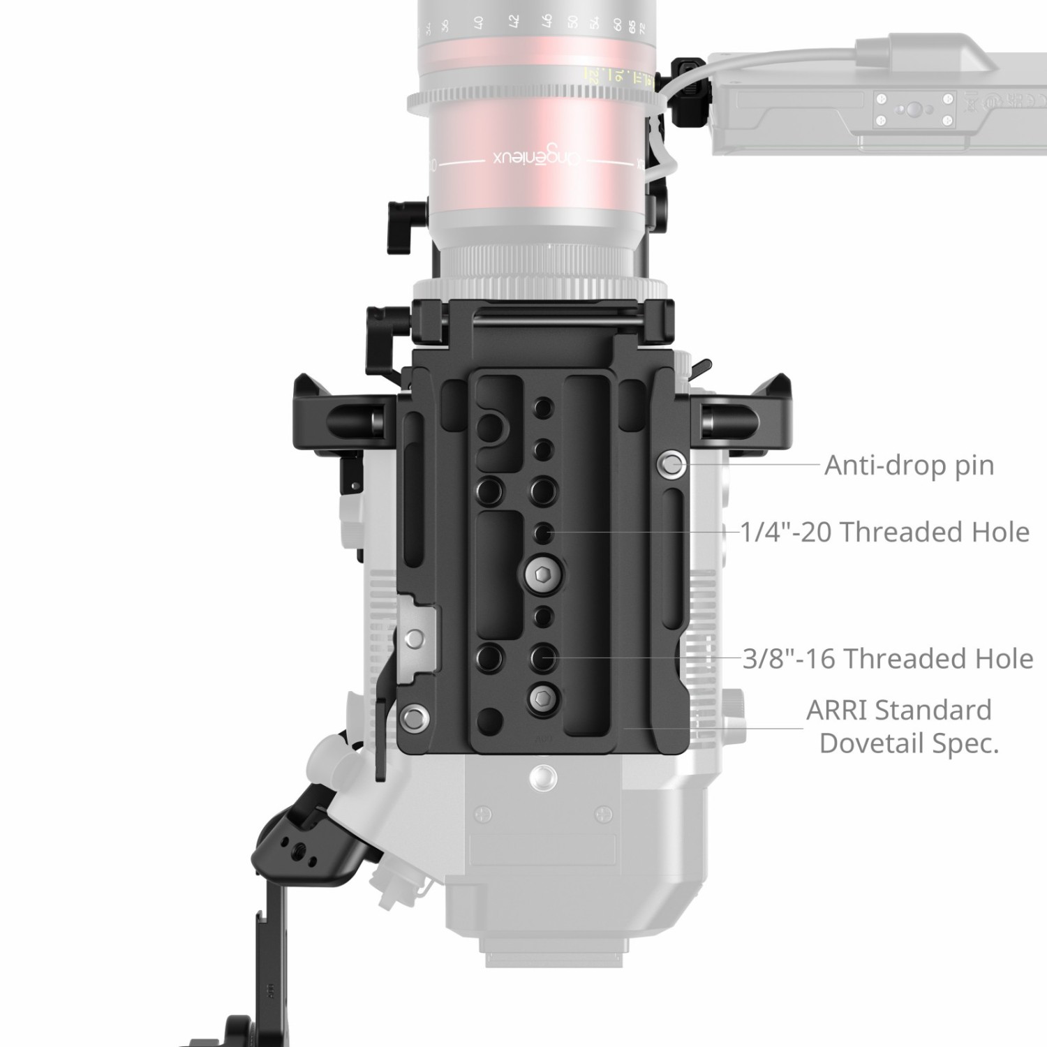 En la parte superior de la jaula se pueden acoplar brazos mágicos (ID 3875, 3874) y abrazaderas de 15 mm para una sola barra (ID 4171) para fijar transmisores inalámbricos, monitores y receptores de audio según sea necesario. La placa base estándar de ARRI con doble abrazadera para barra LWS de 15 mm permite un ajuste rápido sin herramientas mediante una palanca. La parte inferior de la placa base está equipada con pasadores antideslizantes, una placa base estándar ARRI y orificios roscados de 1/4"-20 y 3/8"-16 para garantizar la compatibilidad con las placas base estándar ARRI y las placas puente ARRI BP8 de 19 mm.