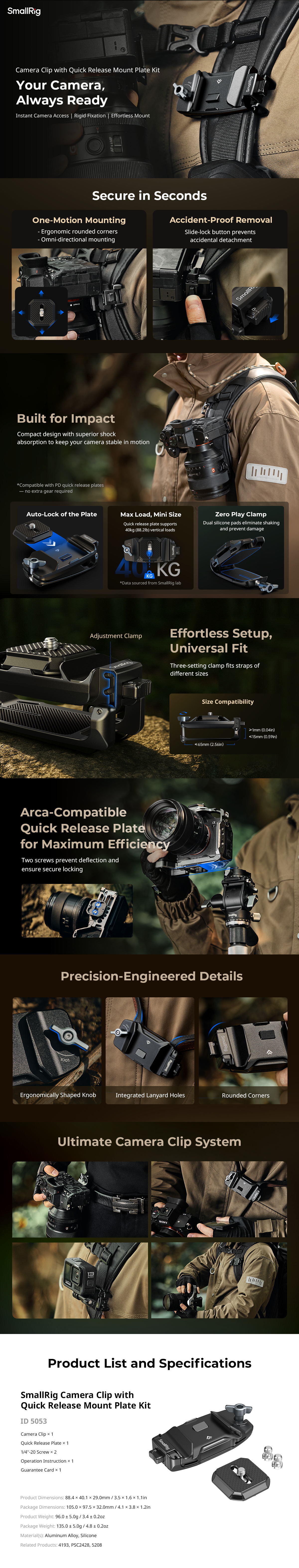 El kit SmallRig Camera Clip con placa de montaje de liberación rápida 5053 está especialmente diseñado para fotógrafos que están constantemente en movimiento. El kit incluye un clip para cámara, una placa de liberación rápida y un tornillo de 1/4''-20, y ofrece un diseño fácil de usar: la placa de liberación rápida se puede insertar en cualquier dirección y se bloquea automáticamente en su sitio. También admite liberación con una sola acción, lo que garantiza un montaje y desmontaje muy eficaces.