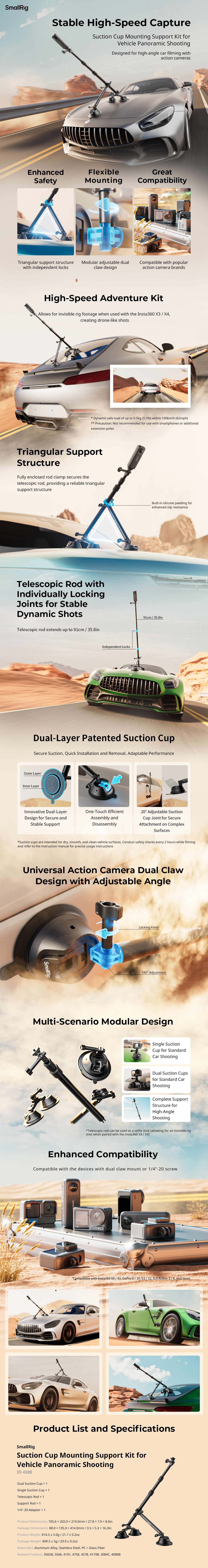 El kit de soporte para coche SmallRig Camera Suction Cup para fotografía panorámica 4380 está diseñado específicamente para la fotografía panorámica con cámara en el coche y permite capturar imágenes desde una altura baja con efecto de dron. Este kit de soporte tiene un diseño modular e incluye una ventosa doble, una ventosa simple, un brazo telescópico, un brazo de apoyo y un adaptador de 1/4"-20. Este kit de soporte, fabricado en una resistente aleación de aluminio, garantiza estabilidad y una larga vida útil, y soporta hasta 0,5 kg / 1,1 lb, por lo que es adecuado para la mayoría de las cámaras de acción del mercado. El diseño de las ventosas de un solo toque permite un montaje y desmontaje rápidos, mientras que la estructura patentada de doble capa de las ventosas proporciona un soporte seguro y estable para tus necesidades de grabación. Gracias al rango de 20° ajustable en las articulaciones de conexión de la ventosa, puedes fijar fácilmente el soporte en superficies curvas y obtener así ángulos de grabación versátiles.